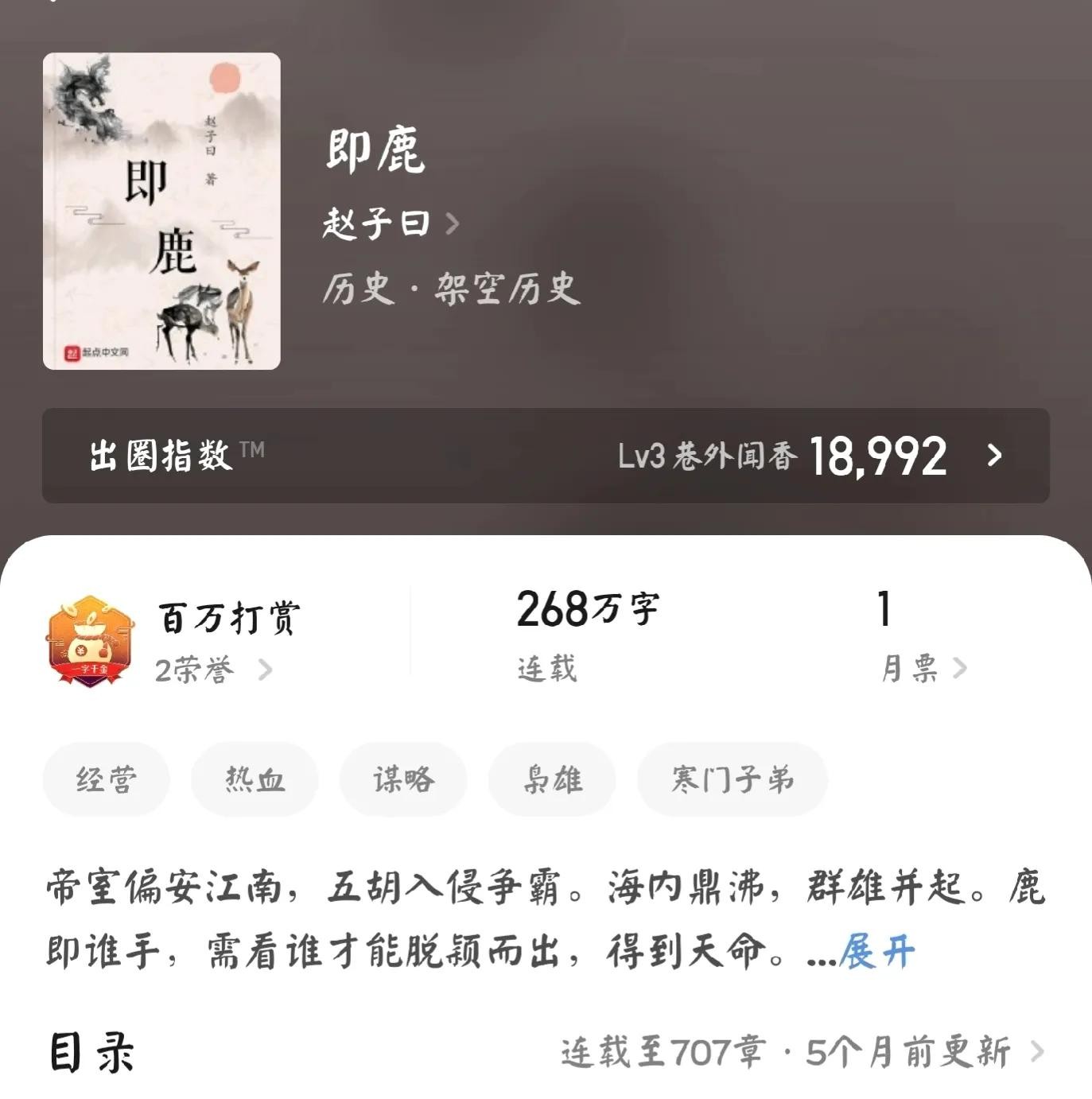 第三本《即鹿》作者:赵子曰,字数:268万字。秉承着老赵一如既往地风格,文风古意昂然,细节考究,符合真实历史。值得一看!但是也有以往的毛病,到后面就变成了月更。我已嘱咐子女,待到此书完结日,家祭勿忘告乃翁。