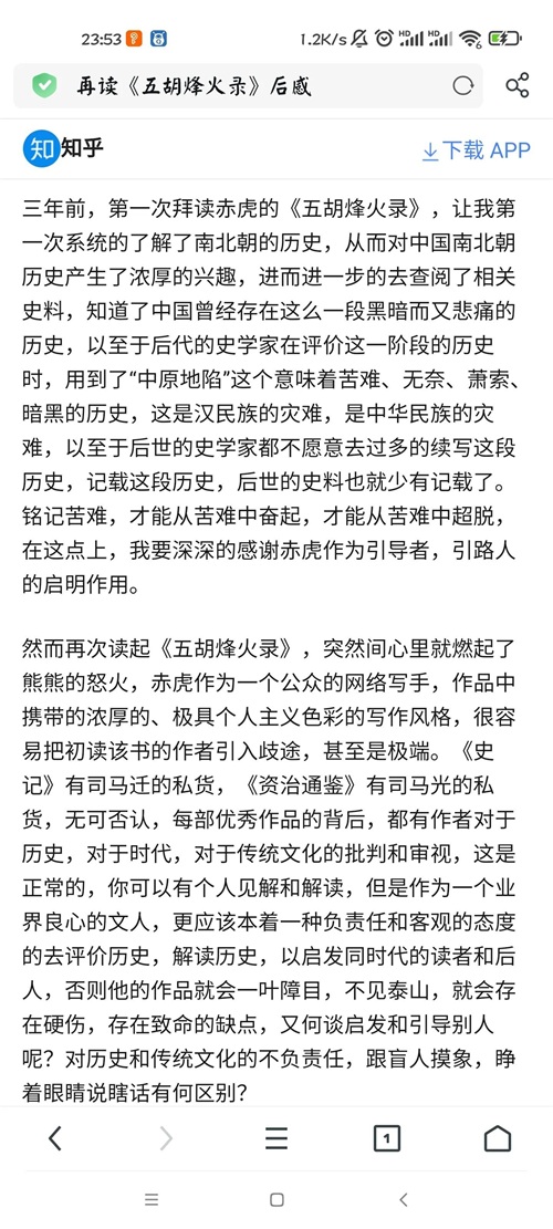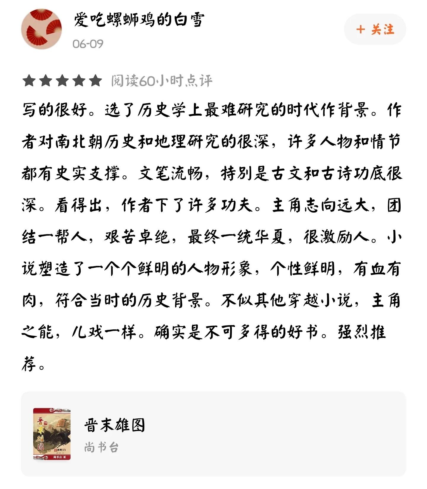 第二本《五胡烽火录》作者:赤虎,字数225万。已完结。赤虎也是高产历史类作家了,他的书说实话,我不是很喜欢,有点偏激,夹带私货过多。但仍然值得一读!此书书评我引用某位网友的,见下图: