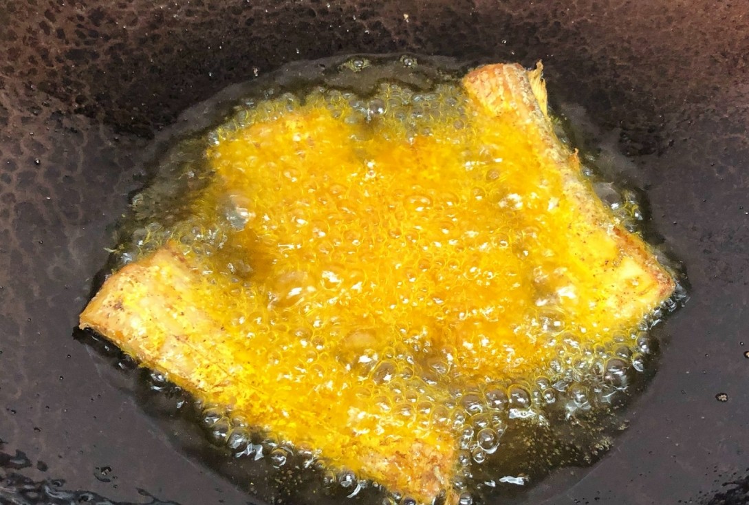 表面风干之后,起锅烧油,油多油少都可以,自己在家里做,油少点,煎炸也可以。油温升高之后,放入带鱼段煎炸,炸至表面金黄,大概煎炸三四分钟就可以了。