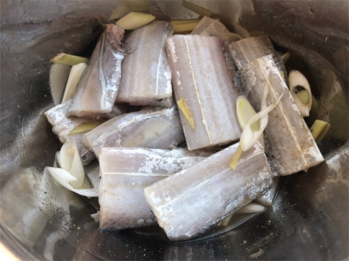 将带鱼切段,大概四指一段就可以。然后撒些盐、味精、胡椒粉和料酒,涂抹均匀,腌制1个小时左右。