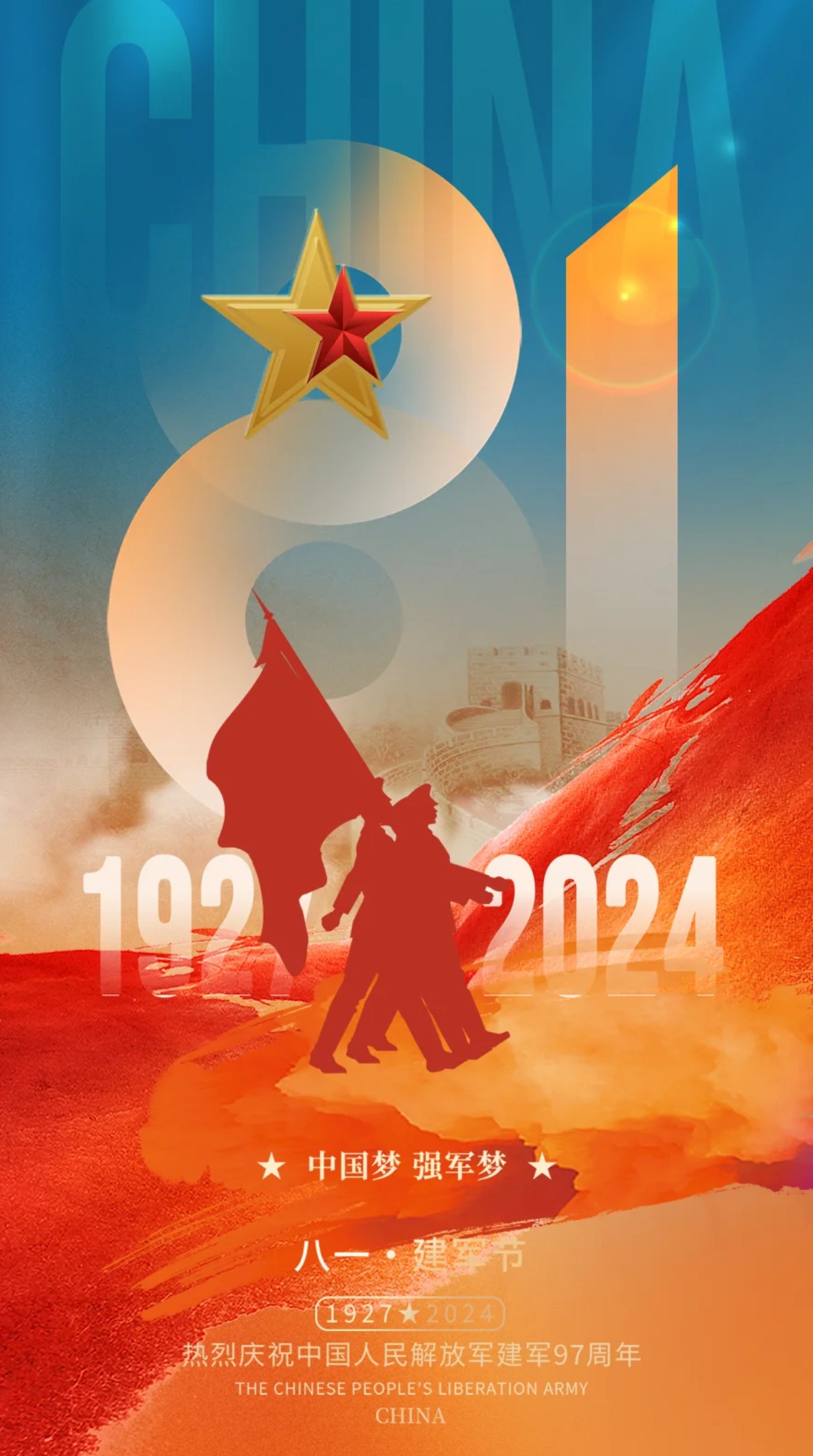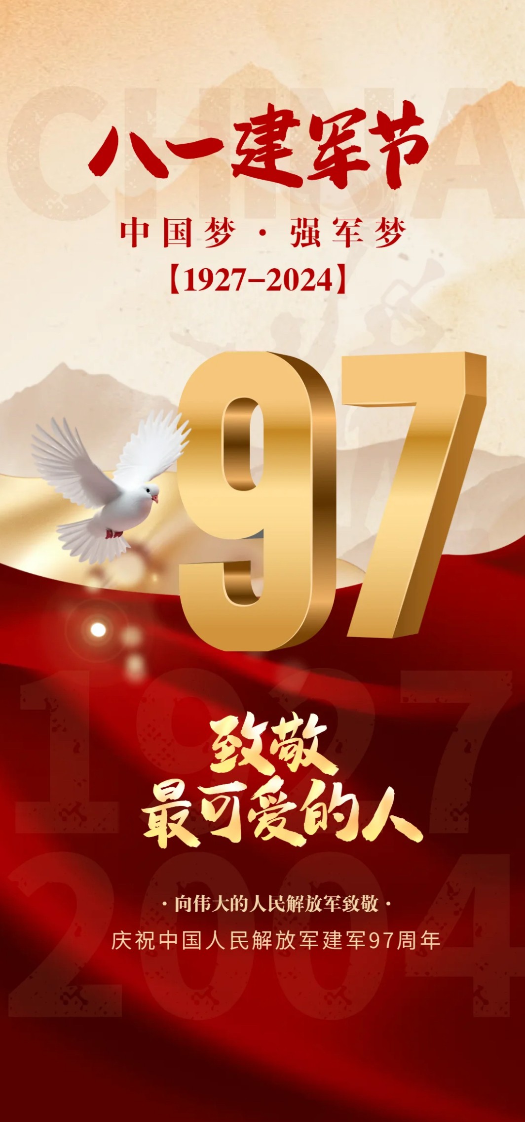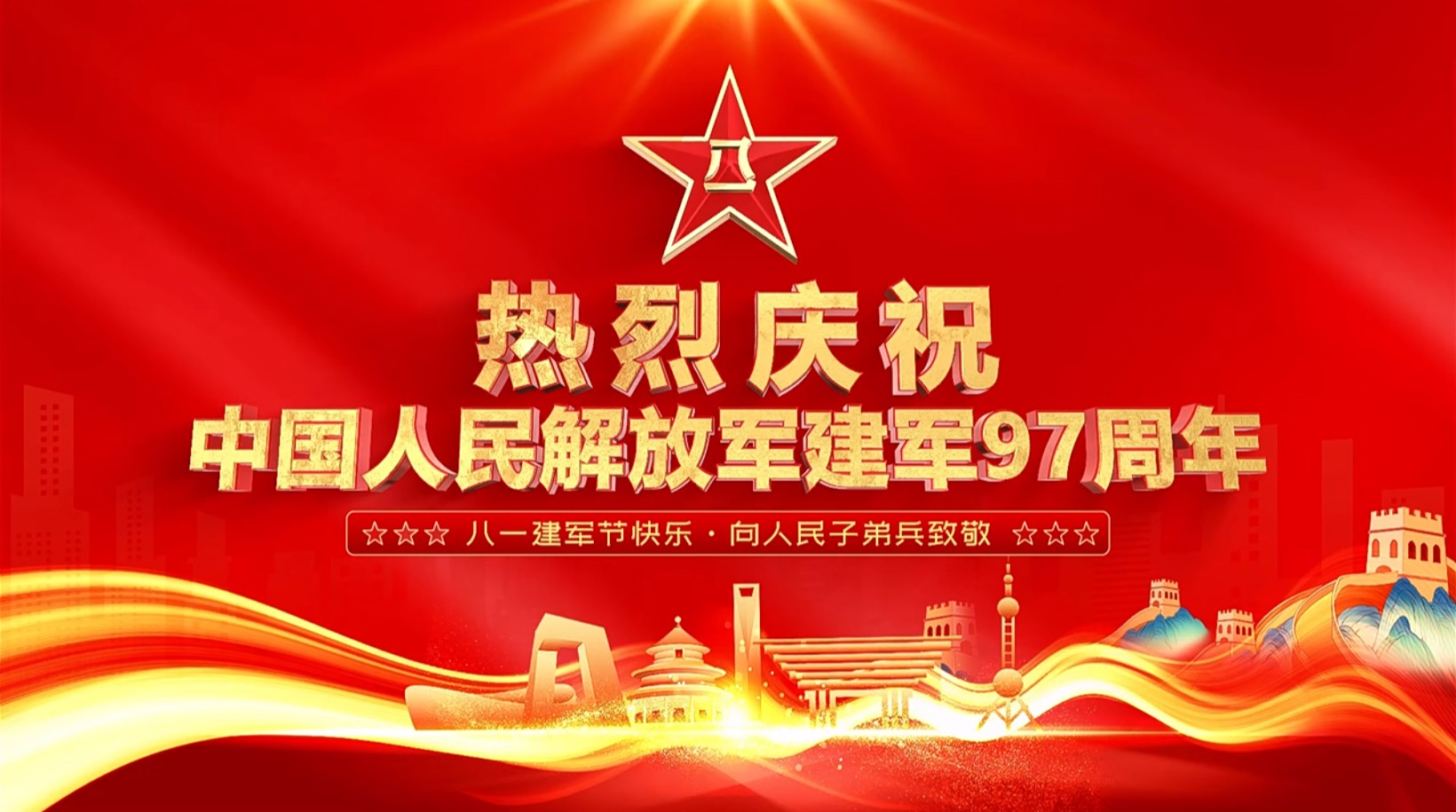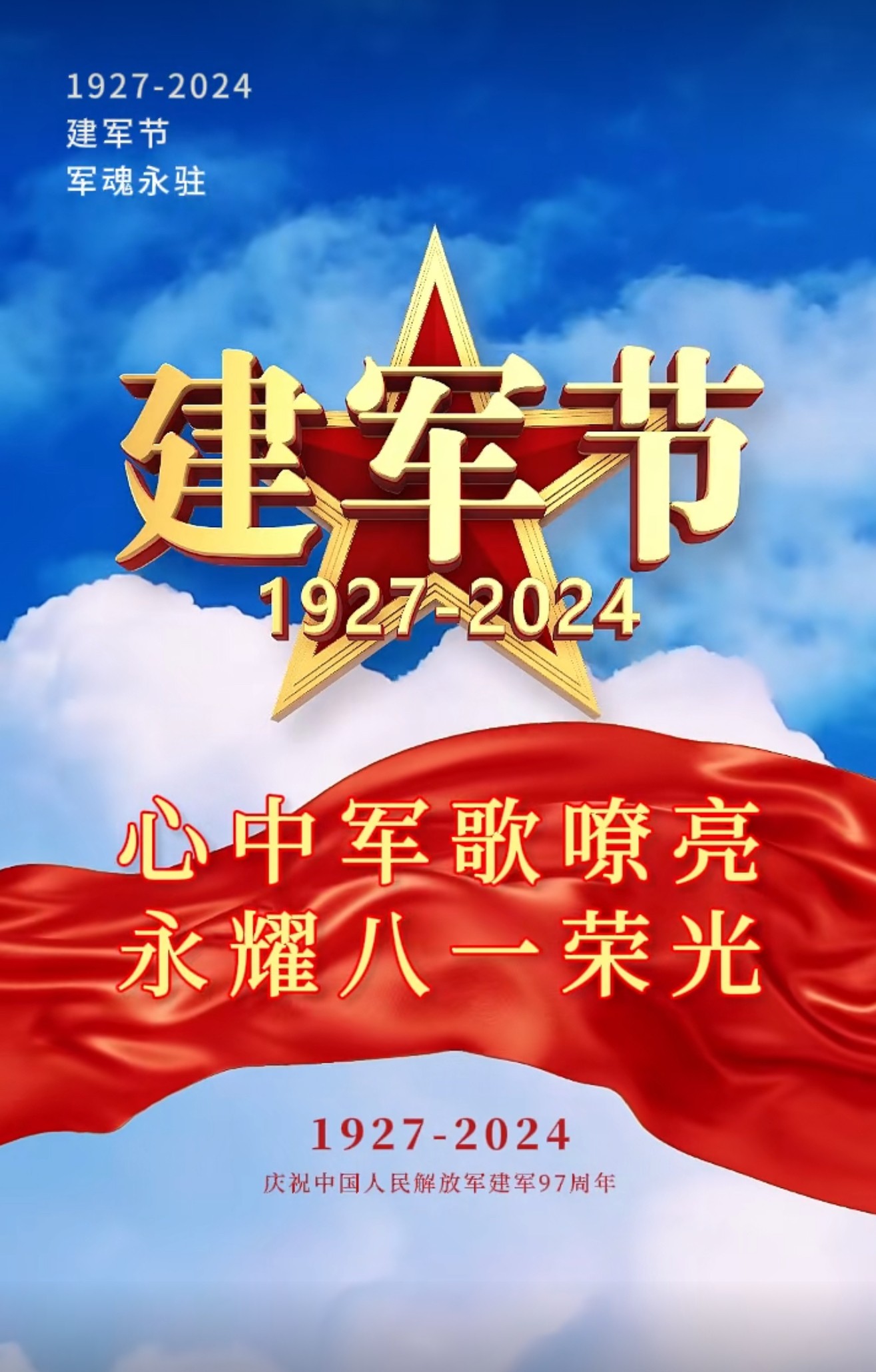 早上好,今天是8月1日,八一建军节,热烈庆祝中国人民解放军建军97周年,不忘初心,牢记使命。以爱之名,致敬每一位军人!