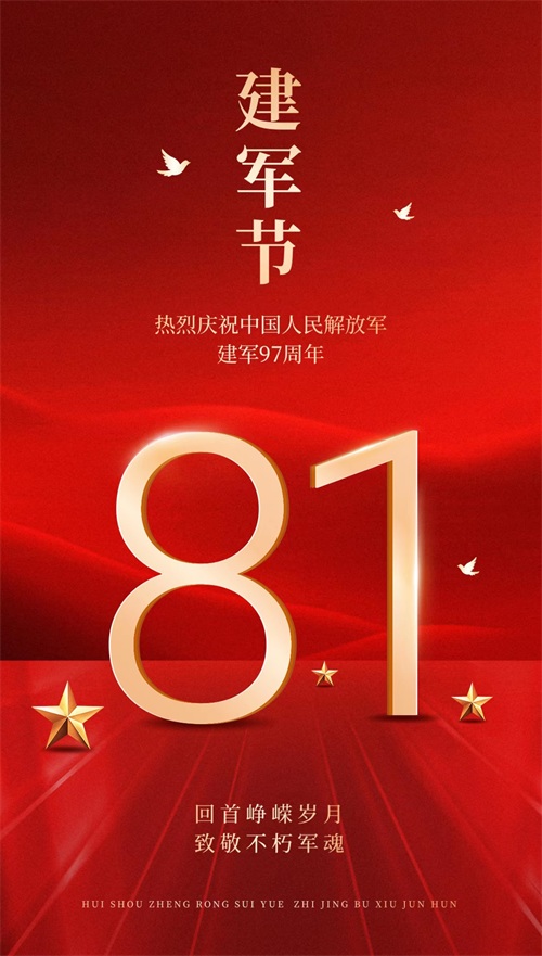 骄阳似火的八月,我们迎来了一个庄严而神圣的日子------八一建军节。生在红旗下,长在春风里,百年征程,波澜壮阔。热烈庆祝中国人民解放军建军97周年,祝福所有解放军子弟兵节日快乐!早安!