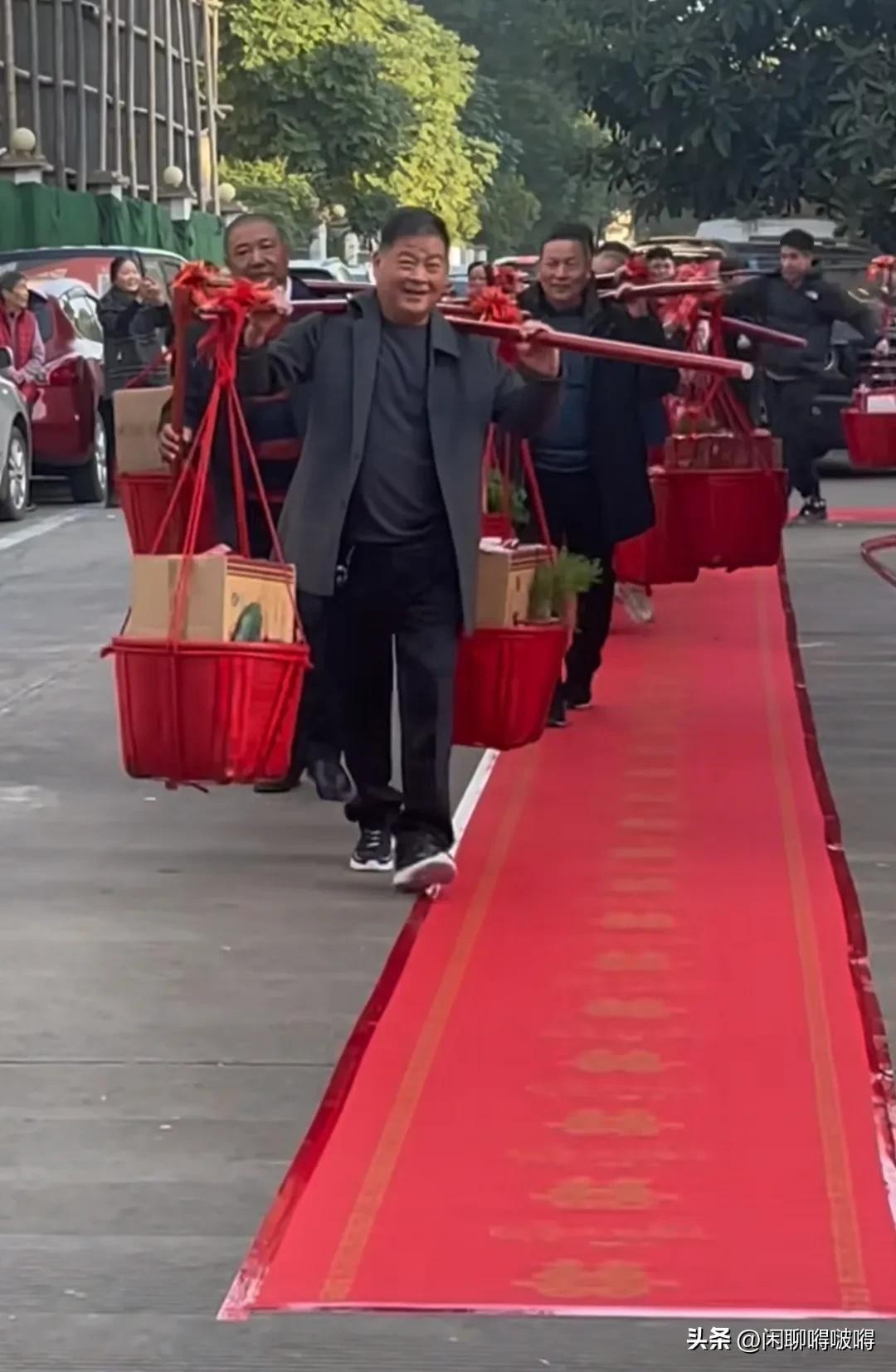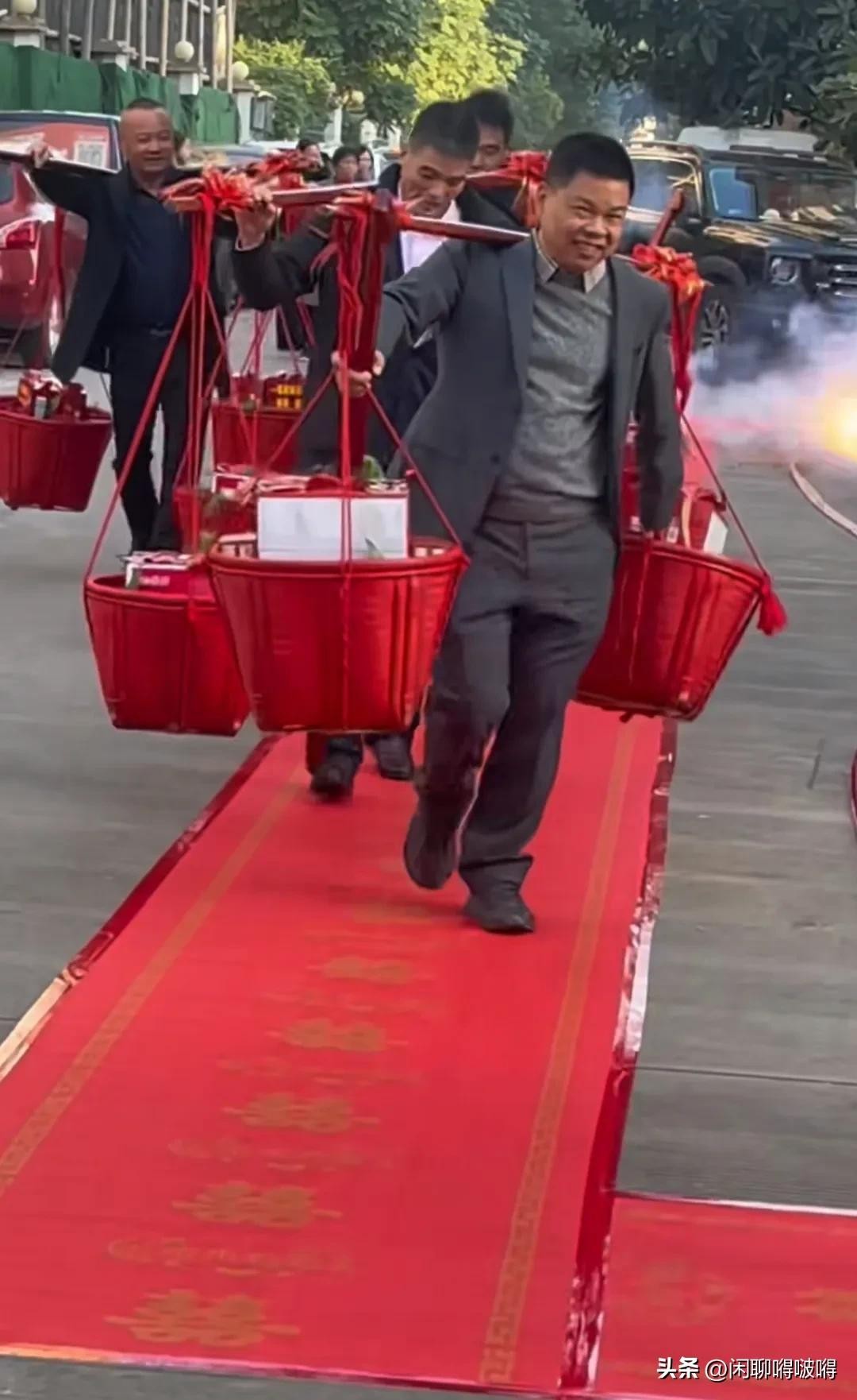 走在男子身后的是两名手提红色竹篮的中年男子,竹篮用红色的布盖着,竹篮上还系着红花,很是喜庆。