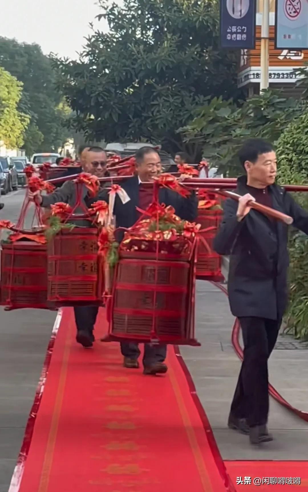 这就是义乌的传统订婚仪式十八担。义乌的订婚传统有6担、8担、12担、和18担,18担是订婚传统的最高规格。