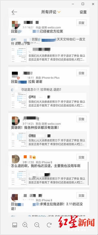 期间,小开同学采取了发微博并@一些有影响力媒体的方式,此举引来了很多有同样情况消费者的关注。小开同学和他们一起组建了一个盼达维权群,群里面包括郑州、武汉等地的消费者,他们还去盼达官方微博下面评论要求退押金,但评论总是被删,更有其他消费者被直接拉黑。