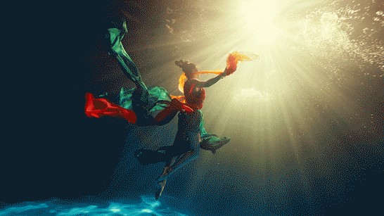 《洛神赋》中一句“灼若芙蕖出渌波”,石榴色与渌波色纱裙伴随着舞蹈动作在水下翩翩起舞,穿越千年又直指人心。