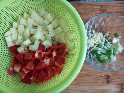 2、土豆切丁,放入清水去掉淀粉。柿子椒切丁,去掉里面籽。蒜姜葱切沫。