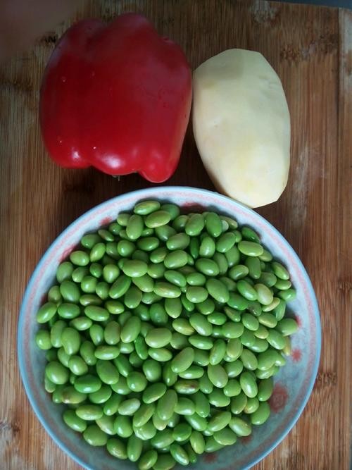 毛豆:300克土豆:1个红柿子椒:1个豆辨酱:适量姜:少许蒜:适量葱:适量糖:适量生抽:适量胡椒粉:少许味精:少许