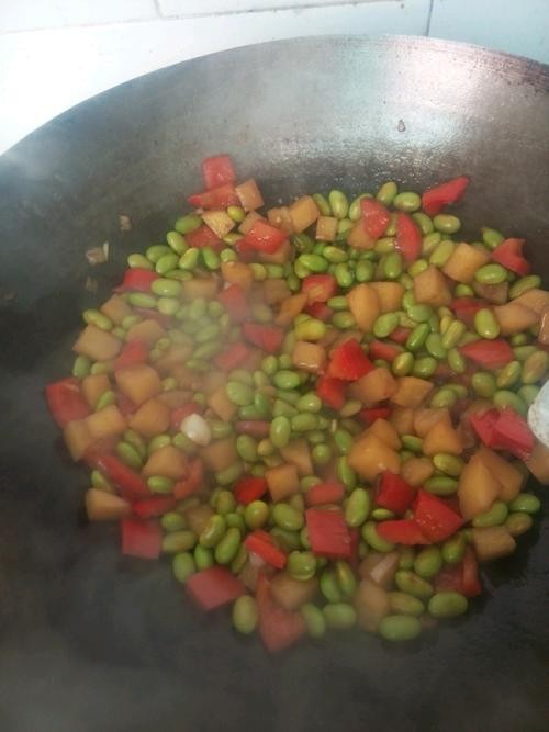 毛豆提前焯烫一下,可缩短炒制时间,土豆加入一些水烧制片刻即可入味又能保证土豆熟透。