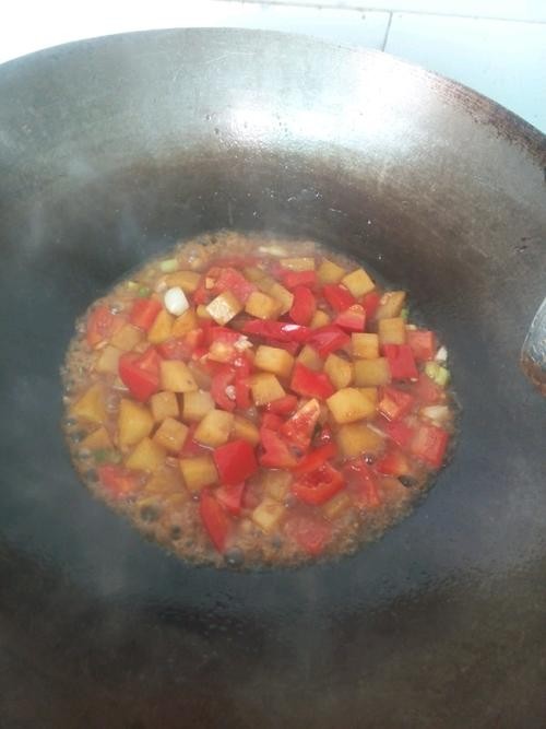 4、放入土豆翻炒,加入柿子椒翻炒。
