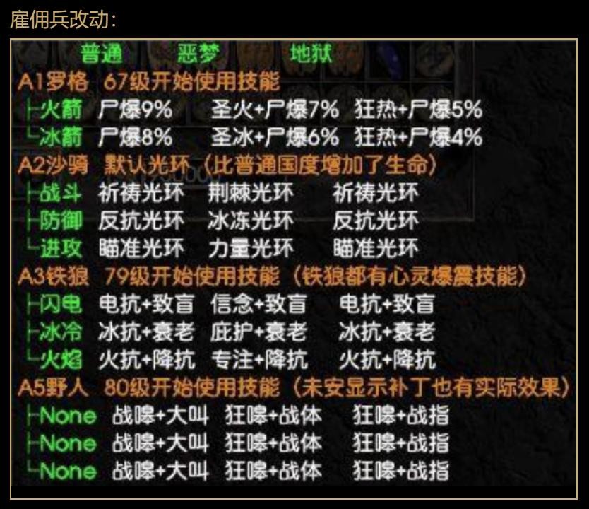 再者,从玩法机制来看,像在佣兵系统方面,它打破了以往常规的佣兵选择模式,不同幕的佣兵被赋予了更多独特且实用的技能,像 A1 佣兵带狂热光环且射箭后有概率放亡者守卫、A3 佣兵带信念光环、A5 佣兵能 BO 等,玩家可以根据自身角色特点和战术需求去搭配不同的佣兵,衍生出多样的玩法策略。