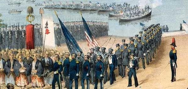 【2】、突然,一个幽灵飘到了日本上空。西元1840年,天朝上国的大清被英吉利打败。以儒家思想立国的中国在日本人心中一直是个大国,但这样的泱泱大国居然被几艘小小的英军军舰给击败了。至美国“黑船”到来之际,日本武士们发现自己祖上流传下来的盔甲早已破败,不得已很多武士穿着消防服为战袍,重新披挂上阵,结果发现对手的舰船如同一座海上堡垒。日本当时最大的战舰也只有佩里少将旗舰的20分之一。根本没有任何获胜的机会。终于,忽必烈花了好大代价没有降服的日本,美国人不费吹灰之力就办到了。