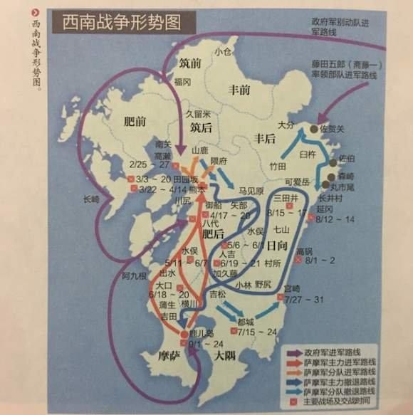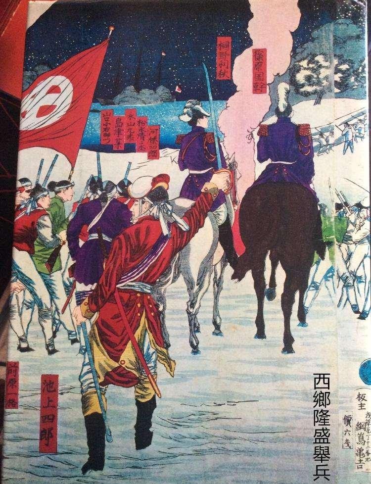 【11】、西南战争的主角,是明治维新的三杰之一的西乡隆盛。西乡隆盛时任明治政府的陆军大将,个人魅力极大,追随者众多。西乡隆盛此前因为征韩问题和大久保利通、木户孝允发生过严重冲突。盛怒之下,离开政府,回到鹿儿岛,建立了所谓的私学,教授射击、火炮弹道方面的学问,还在鹿儿岛各地建立了分校,俨然一个独立王国。当各地发生叛乱时,西乡还命令手下不可轻举妄动,但西乡的手下炮制了一起所谓的政府谋杀案,逼西乡起兵,一看众意难违,以“咨询政府”的名义起兵,率军向京都进发。