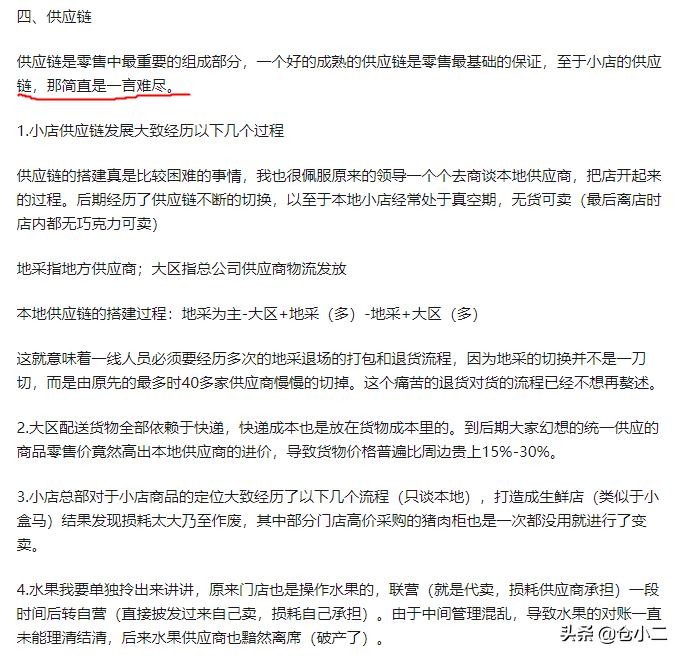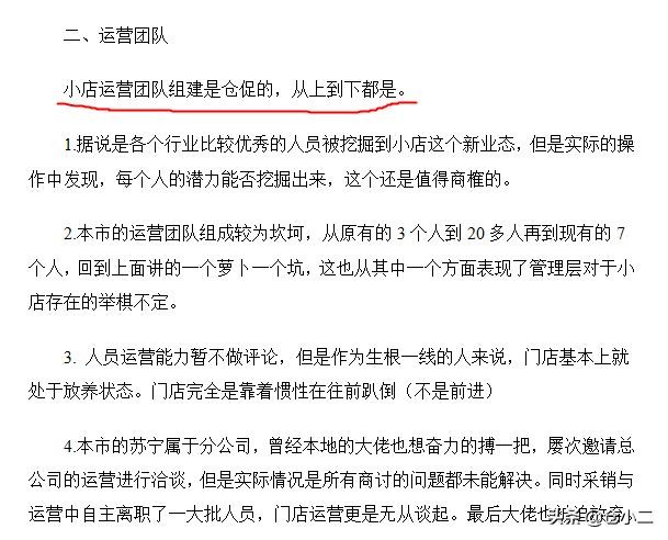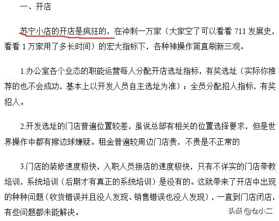以下是部分回答(这位店铺员工从多个方面分析了为什么苏宁小店一夜开遍全城,又一夜关闭将近80%,我截取了一个店运营成功比较关键的四个因素:开店选址装修、运营团队组建、人员培训以及供应链)