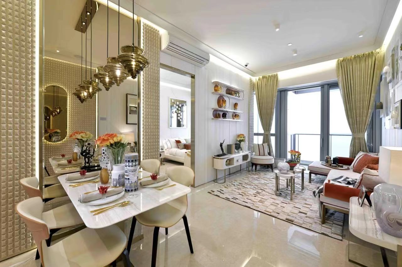单位以米色为主调,以深啡色作点缀,营造柔和温暖的感觉。客厅放有米白色曲尺梳化,地上放有大地色地毯作点缀;另一边墙身则设置物架及电视柜。厅则摆放白色长形餐枱,配衬橙啡色餐椅,呼应全屋主题;饭厅亦设镜面增加空间感。