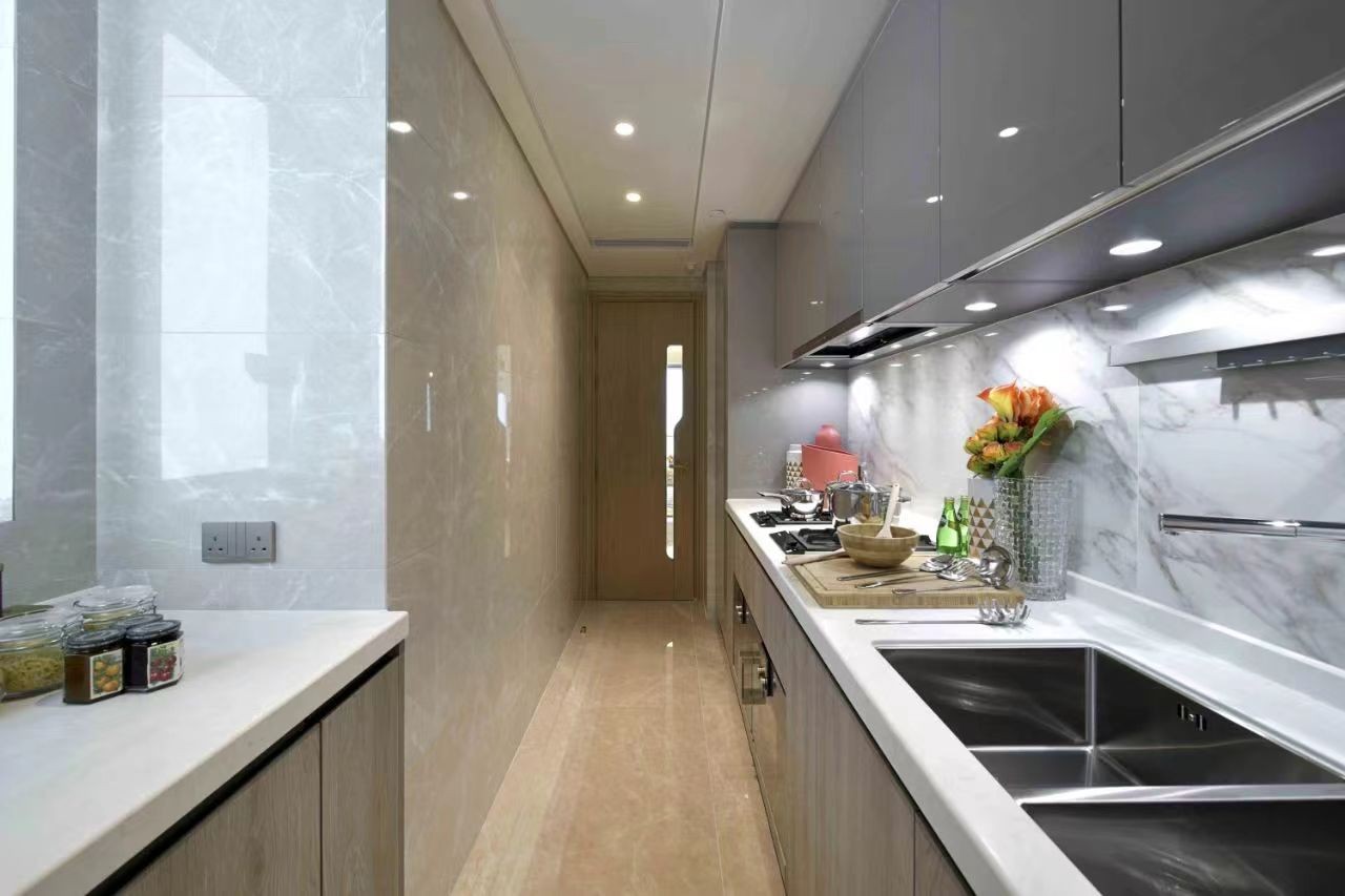 厨房厨柜以浅灰色吊柜配衬浅木色地柜,家电配套齐全,亦提供充足空间处理食材。