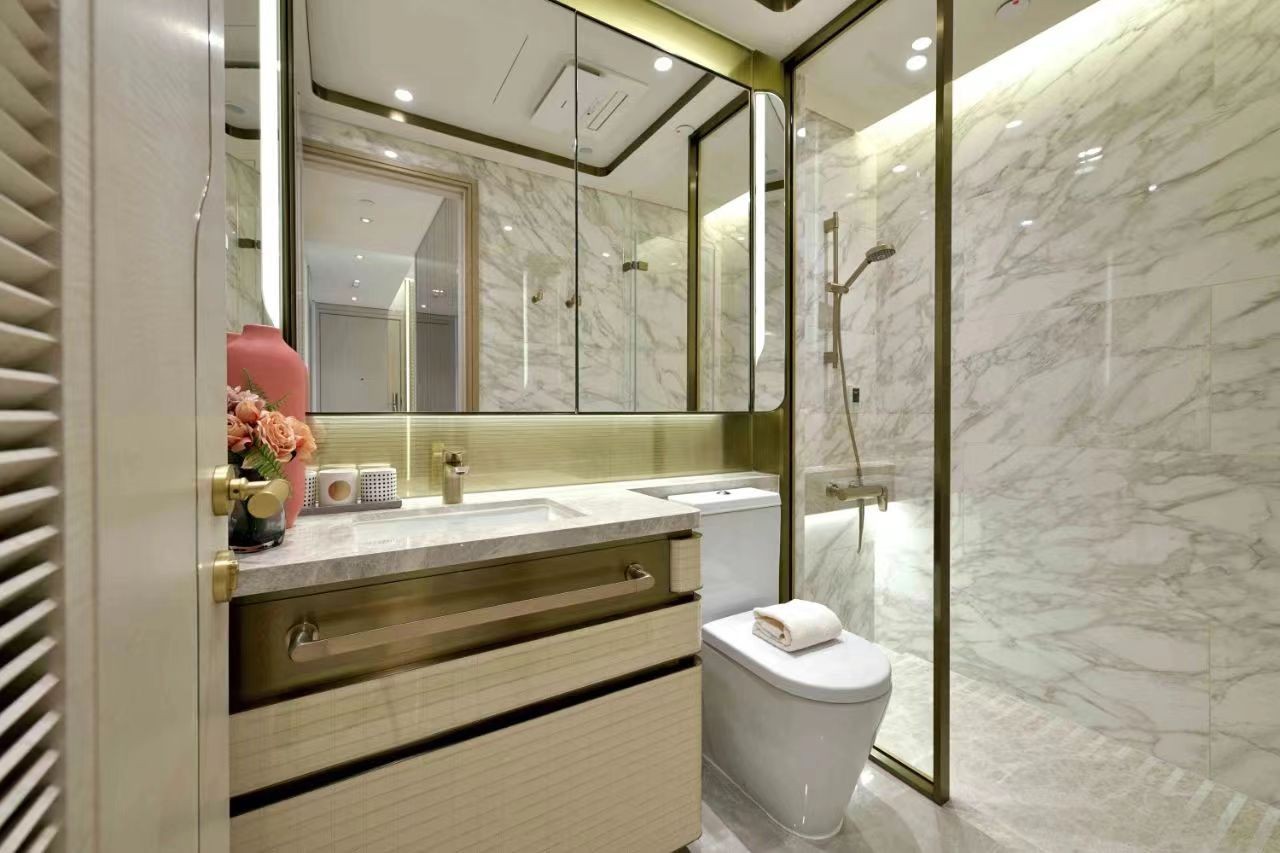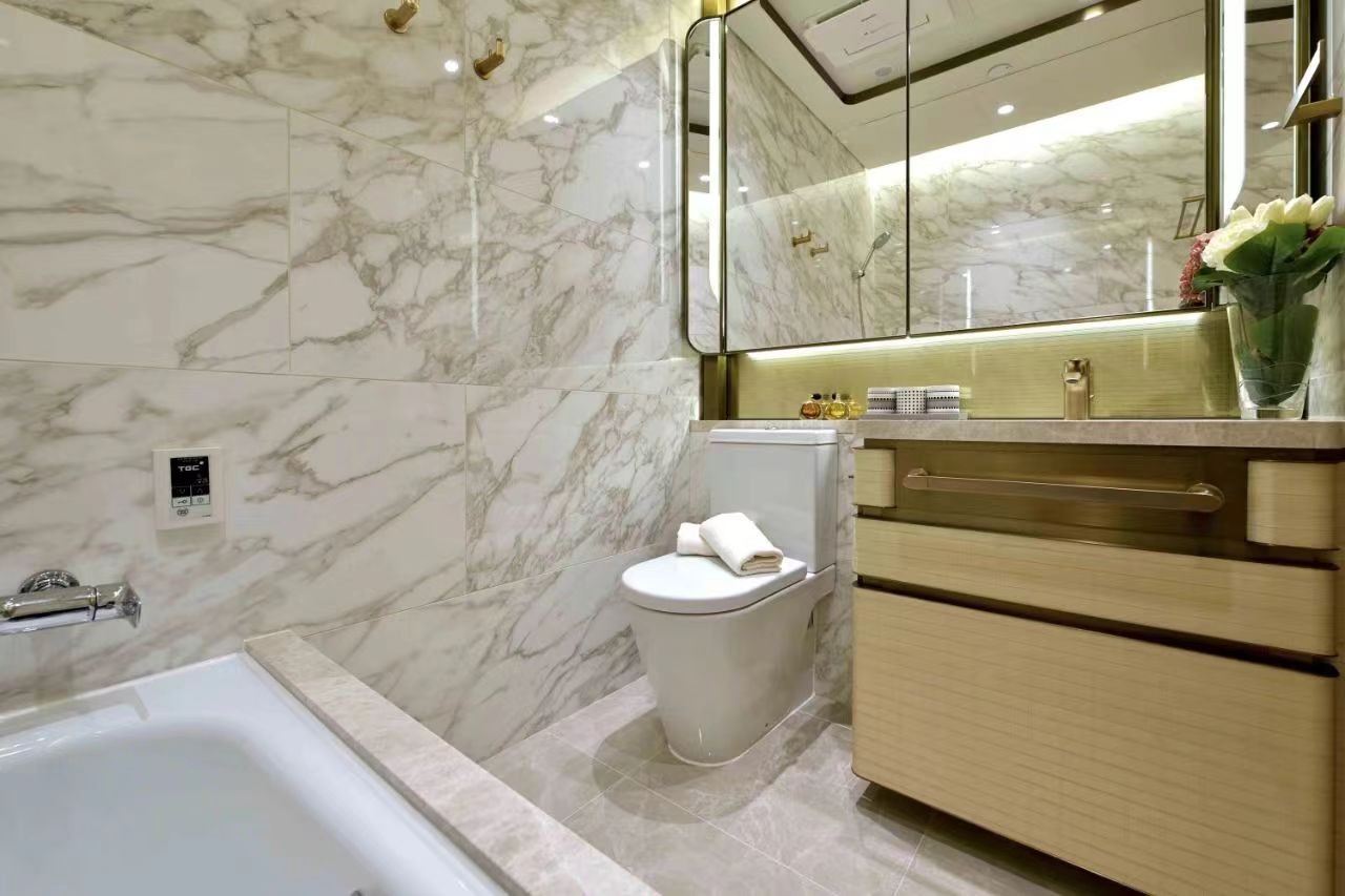 主人浴室以白色石材配衬铜色线条,配有浴缸,高贵典雅。