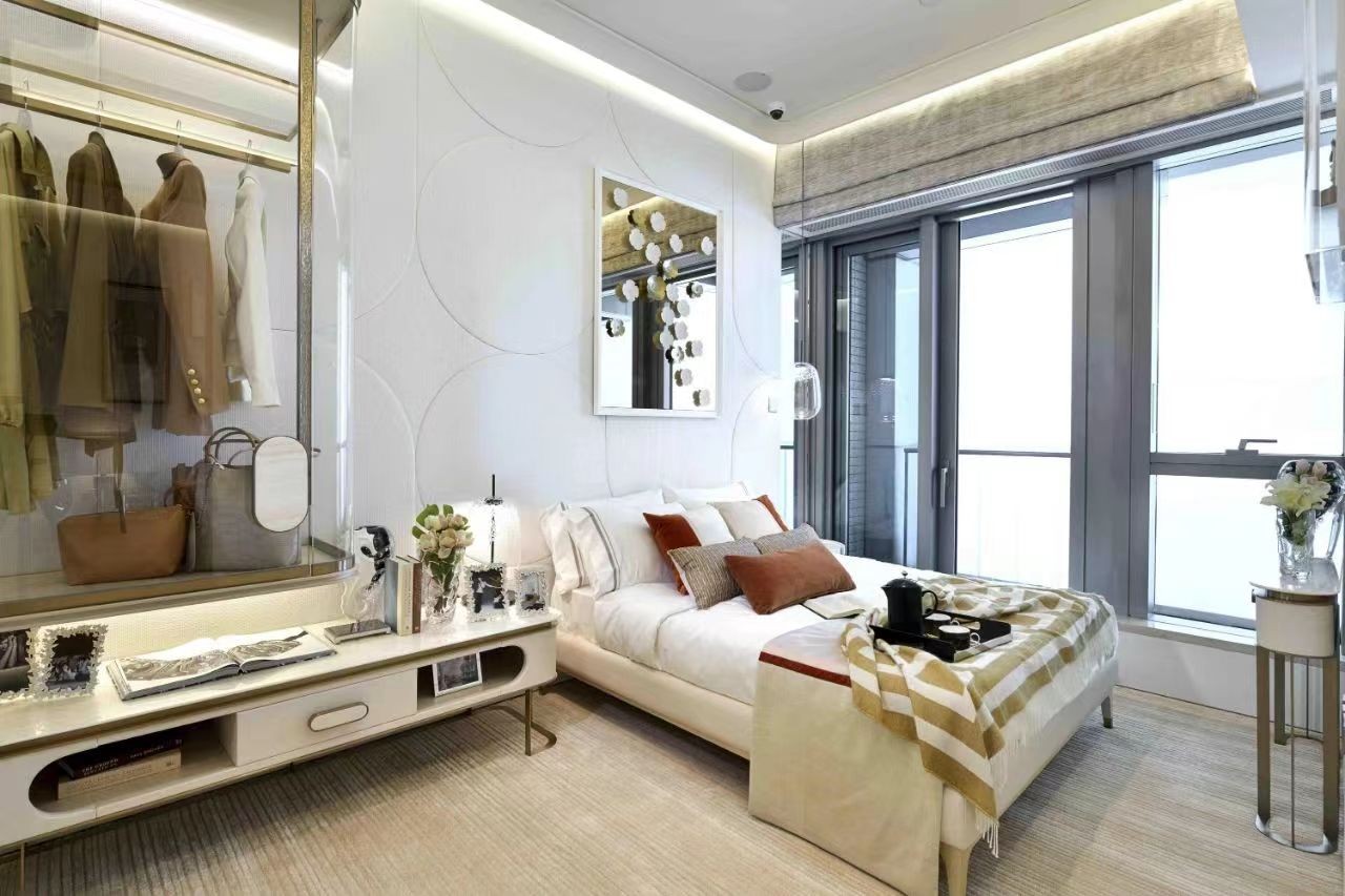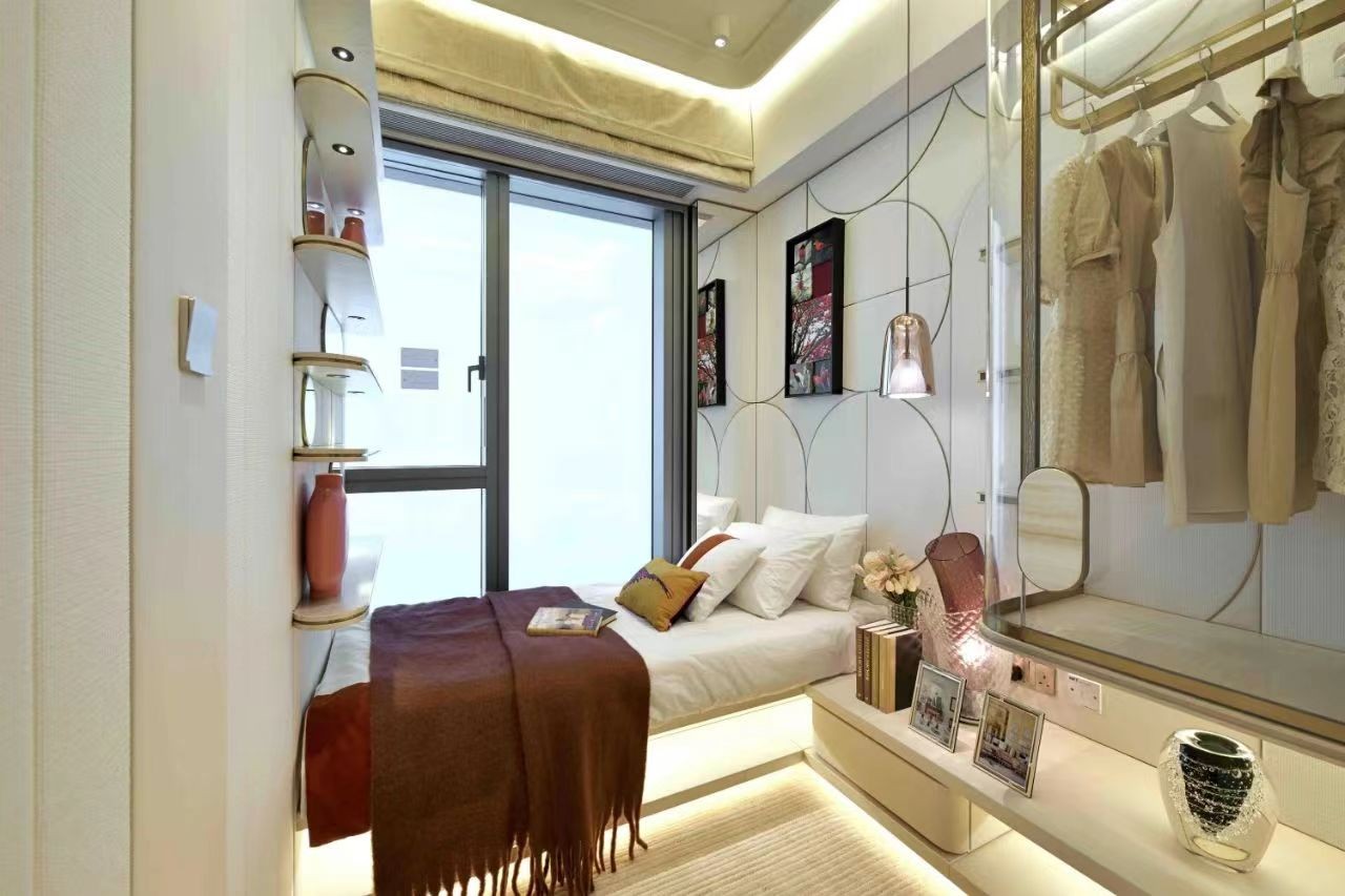 主人房同样以米白色配衬深啡色,贯彻单位风格。房间外连工作平台,有助加强室内通风。