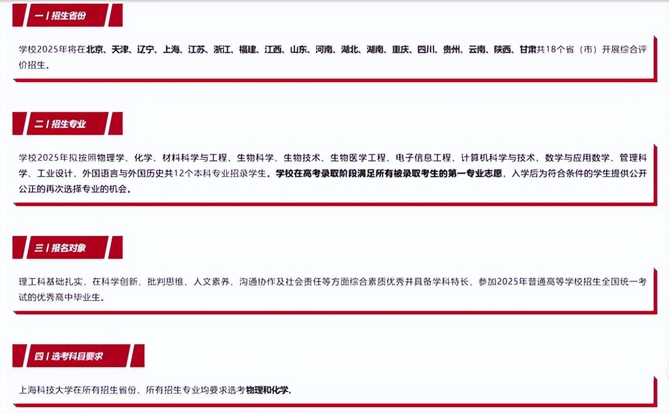 从去年10月开始,上海纽约大学、昆山杜克大学、南方科技大学就陆续发布了招生简章,正式启动本科综合评价招生入学申请。前不久,上海科技大学也发布了《2025年综合评价招生简章》。