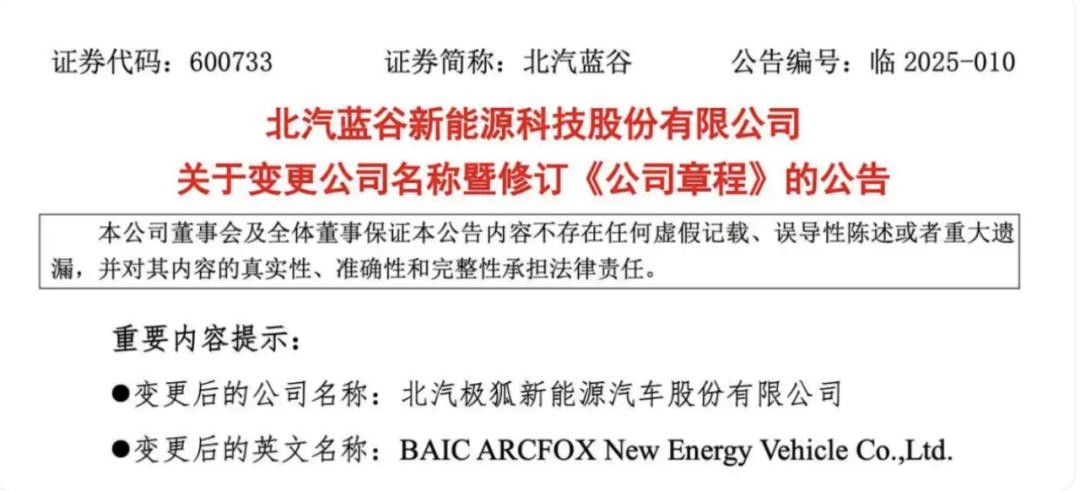 北汽蓝谷公告称,公司正处于战略升级关键期,此举将强化品牌在市场中的辨识度与影响力,实现品牌价值的最大化。