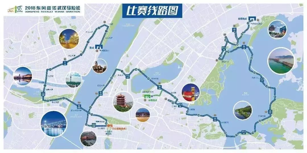 沿江大道青岛路口(起点)—沿江大道—一元路—中山大道—武胜路—江汉桥—鹦鹉大道—龟山南路—长江大桥—黄鹤楼南路—彭刘杨路—辛亥革命博物馆广场(13公里跑终点)