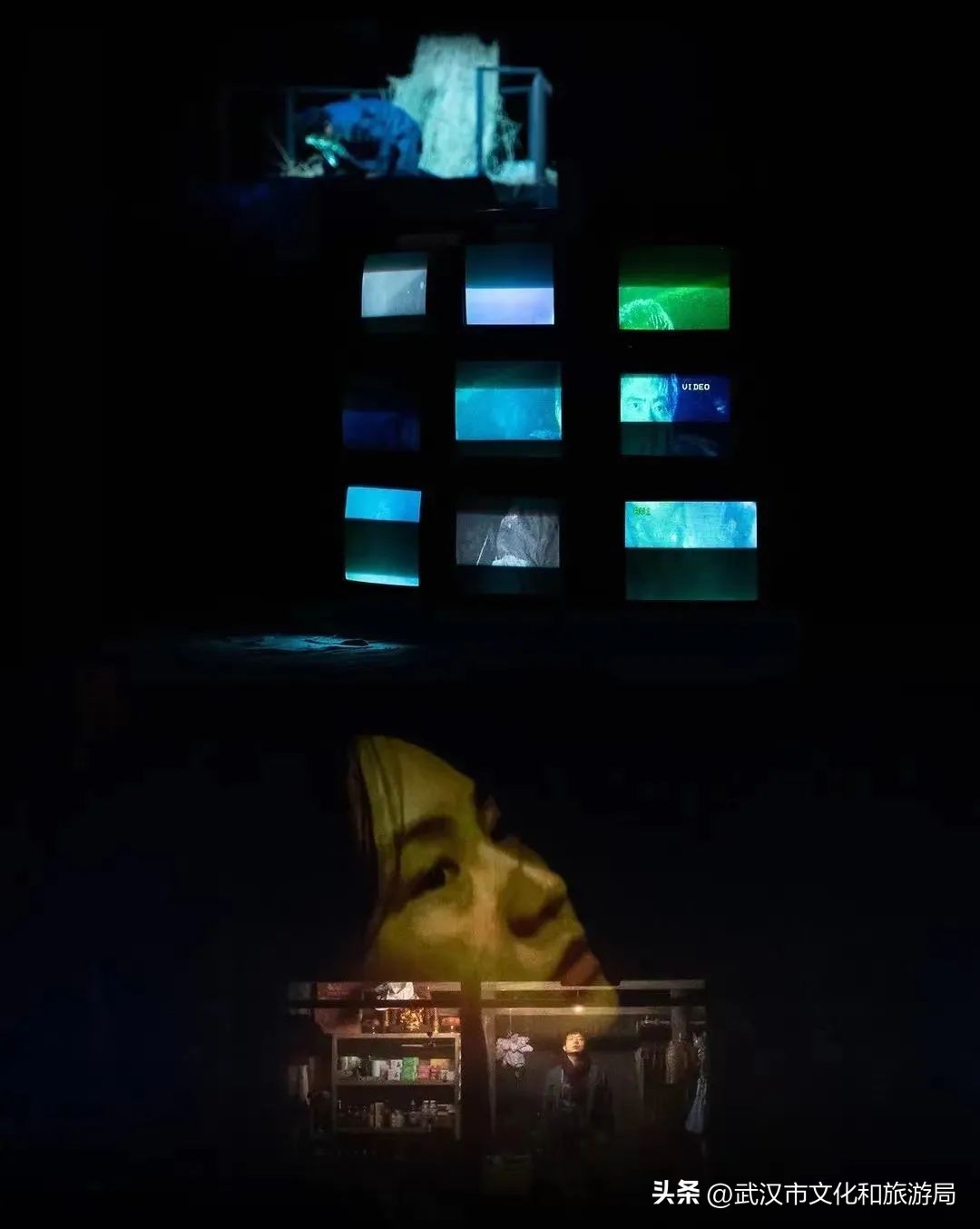 现场还设置了不同角度的视频体现媒介,既有老旧的电视机、当代剧场投影,也有首次尝试的水下拍摄和航拍,通过放大、夸张、变形、迭代等拍摄手段,寻求强烈、有力量的视觉传达力。