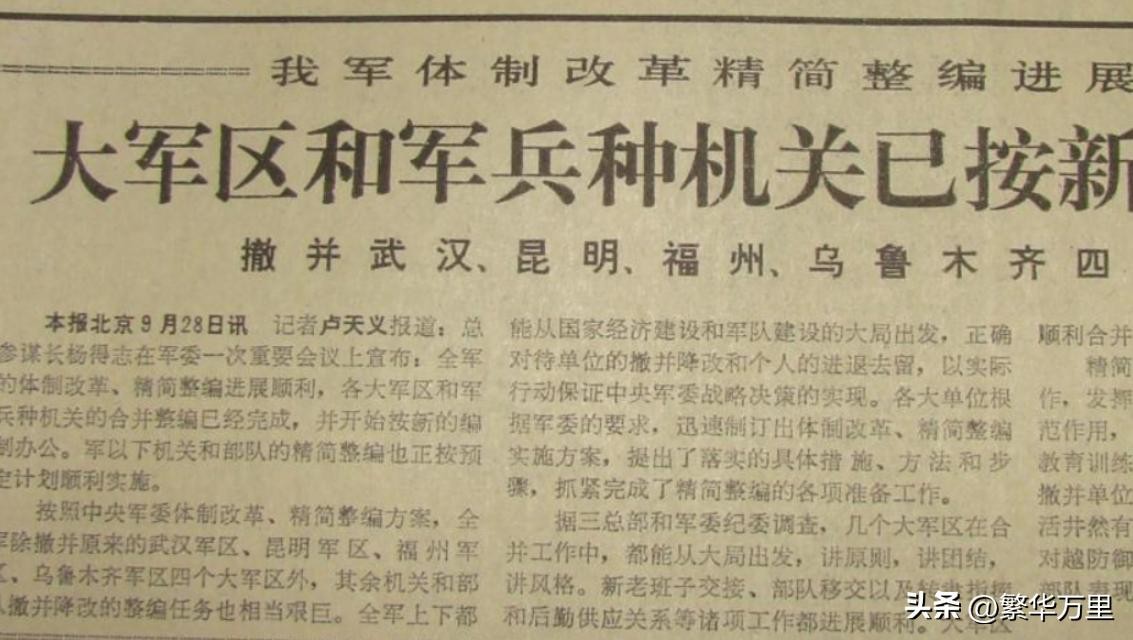 进入80年代以后,世界各地的几场局部性战争,都呈现了高科技战争的影子。同时,北方强敌已经深陷阿富汗泥潭,对我国的直接威胁大大降低。结合各方面的需要,1985年,我国开始了著名的百万大裁军。在这一次大裁军中,福州军区、乌鲁木齐军区、武汉军区、昆明军区被撤销,11个军区调整为7大军区,并且一直延续到了2016年。