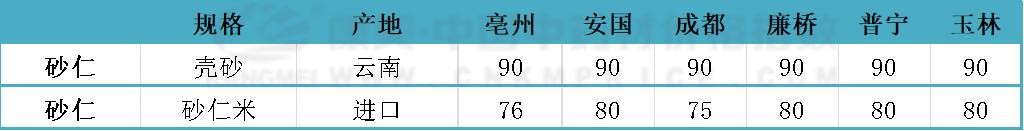 安国:云南、广东即将进入产新期,近期市场货源走销不快,行情进加速回落,现安国市场国产砂仁文山货95元,西双版纳货75元上下。
