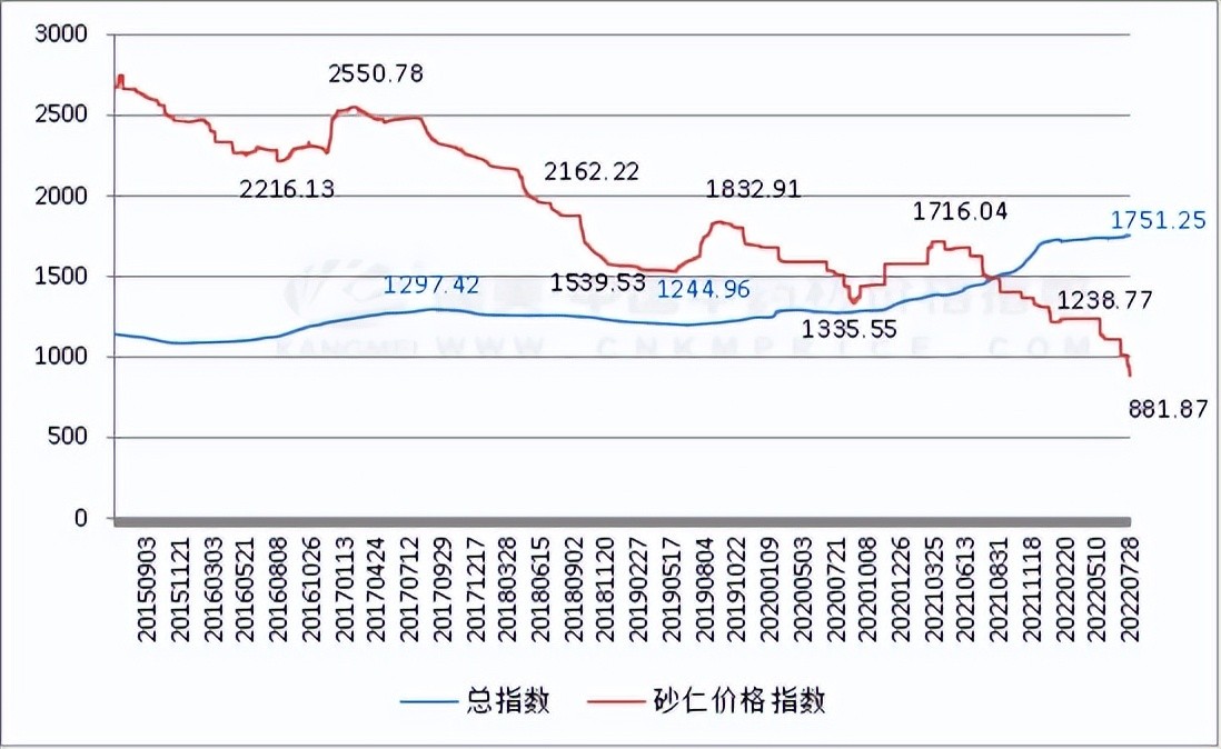 2022年7月28日砂仁价格指数值为881.87点,低于此时总指数的1751.25点。从2015年6月17日至2022年7月28日砂仁价格指数与总指数的历史走势来看,砂仁价格指数与总指数出现一次交叉,与大宗市场背道而驰。