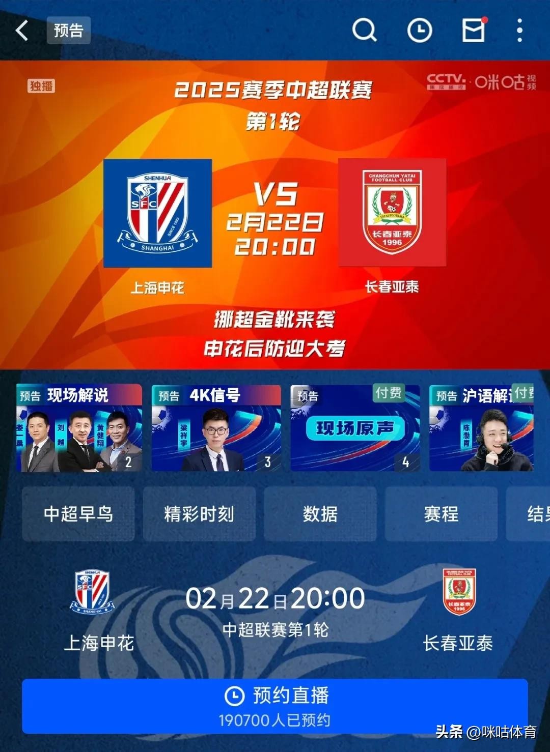 从2月22日起,上咪咕,看中超!全赛季240场比赛,都会在这里一一解锁。