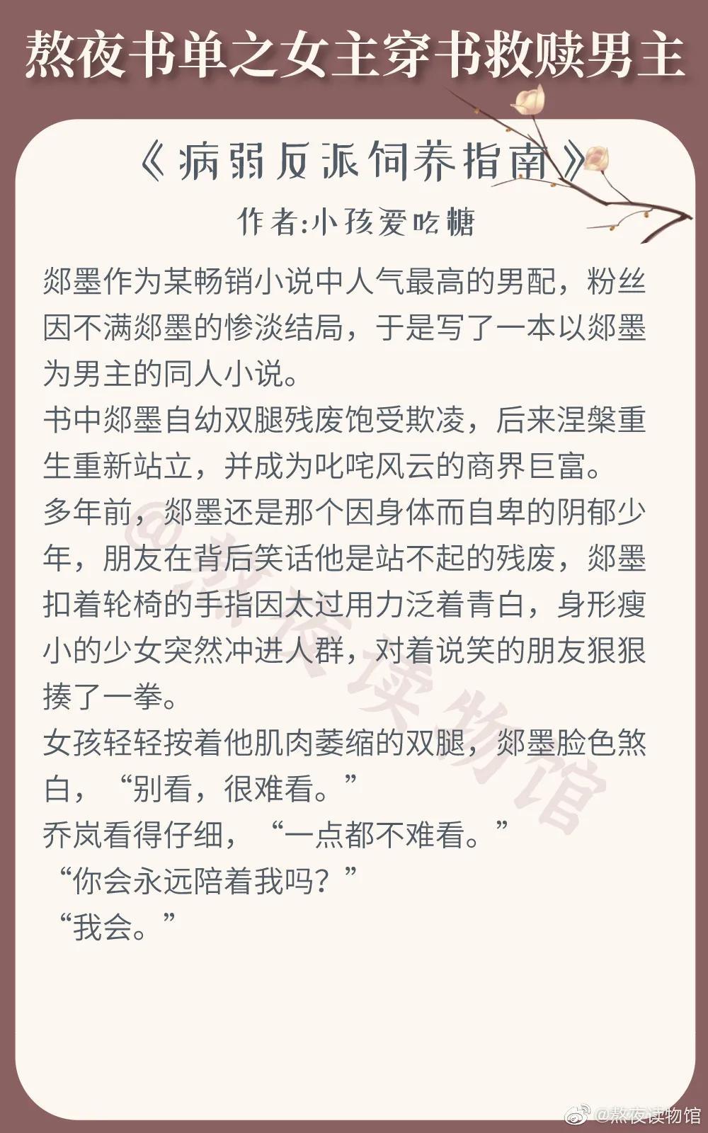 《病弱反派饲养指南》也很好看,真的很好看,就是很喜欢的那种,男主郯墨太惹人疼爱了,女主就是无条件的宠着男主,帮助男主克服疾病带来的阴影,反正就是很好的,很好看,超级好看。