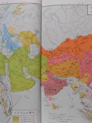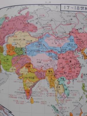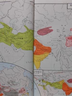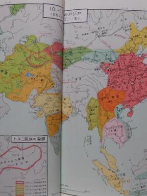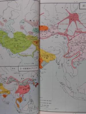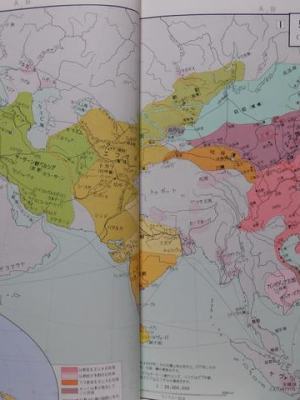 第四张图是5—6世纪的亚洲地图,当时中国处于南北朝到隋朝时期,由分裂走向统一,不过地图反映的主要是南北朝时期。当时的亚欧大陆上的罗马帝国(已经分裂为西罗马帝国和东罗马帝国)、萨珊城市王朝、笈多帝国还保持一定的强盛地形图,不过总体趋势是走向衰落。当时的新兴势力是中亚一带兴起的嚈哒帝国,该帝国击败了萨珊王朝和笈多王朝,占领了西域、中亚和南亚、西亚大片土地,非常强盛。中外历史地图都很少注意这个帝国,亚洲分区图手绘,而日本平凡社将之画入,值得肯定。