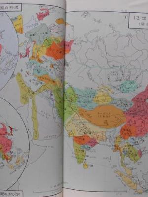 第八幅,是蒙古帝国时代简图的版图。当时的亚洲大陆除了东南亚和南亚,基本被蒙古征服,南亚地区有德里苏丹王朝,西亚有奥斯曼帝国,这些名称都是伊斯兰信仰的王朝。不过,图中画蒙古东北界画到黑龙江,这是有点不客观的。日本绘制的地图,往往不会将黑龙江北岸、库页岛画入中国版图,这是有所企图的。