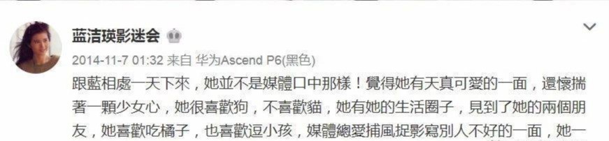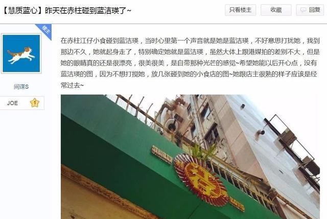 在蓝洁瑛影迷会微博上,没有管理员亲手拍摄的蓝洁瑛照片,粉丝妹妹和蓝洁瑛第一次见面,想和蓝洁瑛合影,但蓝洁瑛拒绝了,这一幕连蓝洁瑛的朋友都看不下去想要促成合影,但小迷妹为了蓝姐就再也没有提过。所以,官微里那些看望蓝洁瑛的内容中,配图只有赤柱的风光,没有其他。