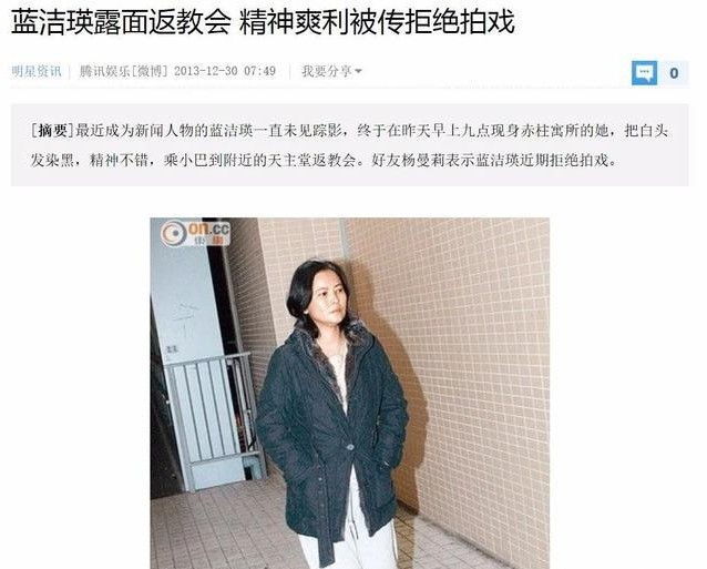蓝洁瑛的母亲和父亲相继在1995年和1996年去世,虽然她有一个姐姐,但很少联系,在2015年的一次采访里,蓝洁瑛说已经两年没有见过姐姐,电话打过去都转到了秘书台,而今天香港警方的声明里也称尚未联系到她的姐姐。所以蓝洁瑛也算孑然一身了,没有父母、没有家人、没有恋人,也很少有朋友,但这不妨碍她活得很从容。