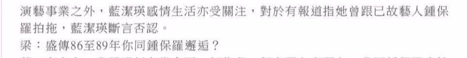 杨曼丽还曾经透露给媒体,蓝洁瑛曾有两位前男友自杀,其中一位前男友是因赌债跳楼的钟保罗,蓝洁瑛为了给钟保罗还债穷尽自己的积蓄。然而后来媒体采访蓝洁瑛,却得到否认的回答,她和钟保罗根本不算熟人。