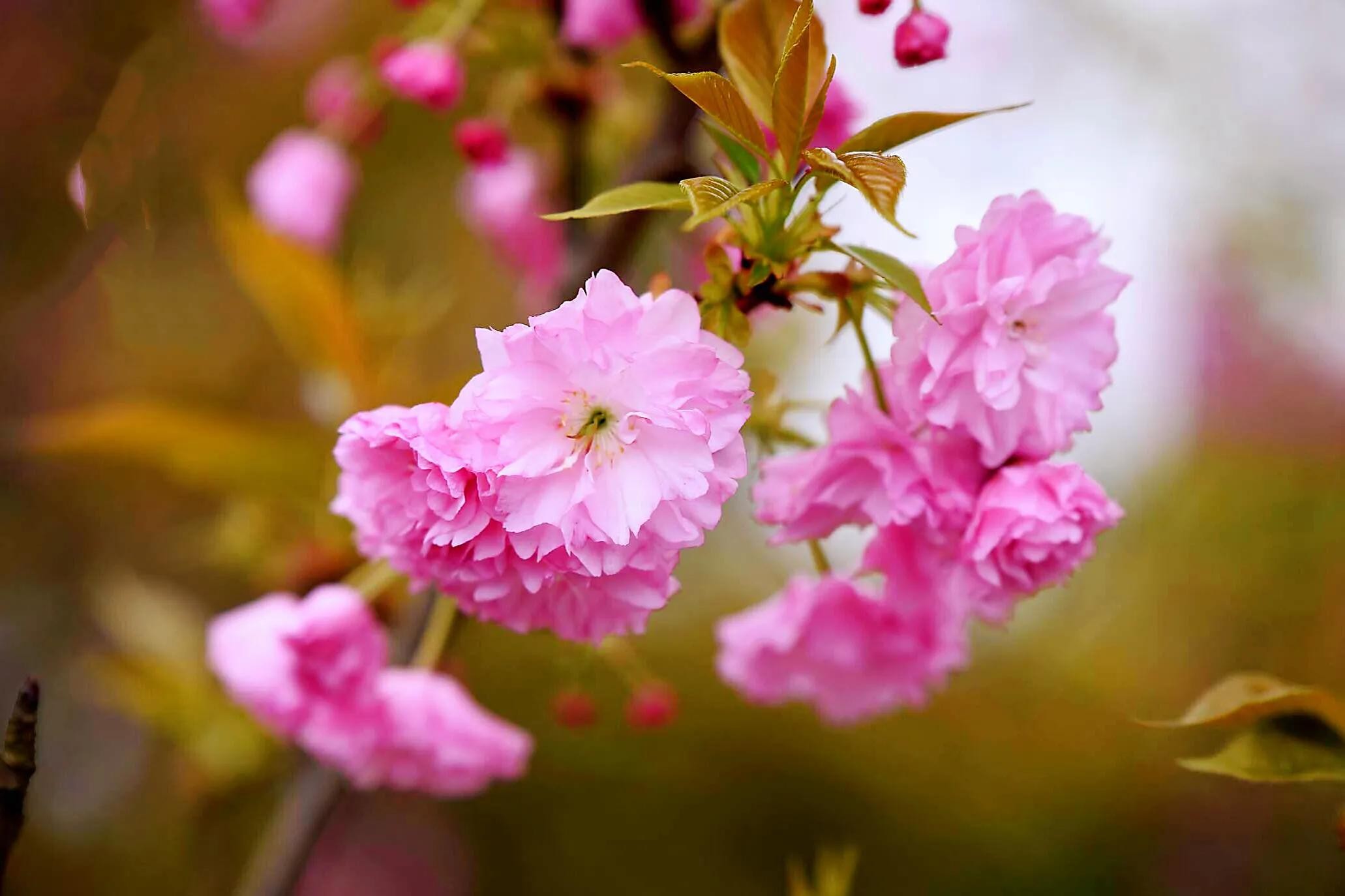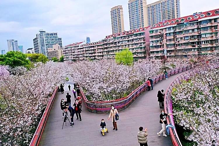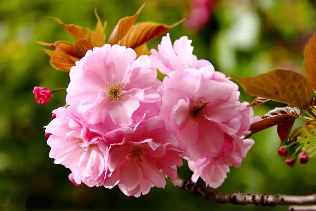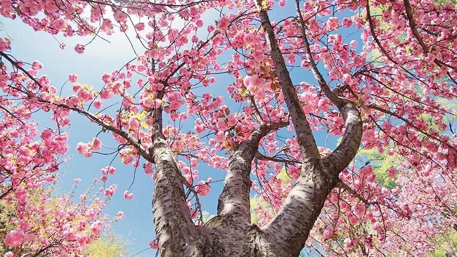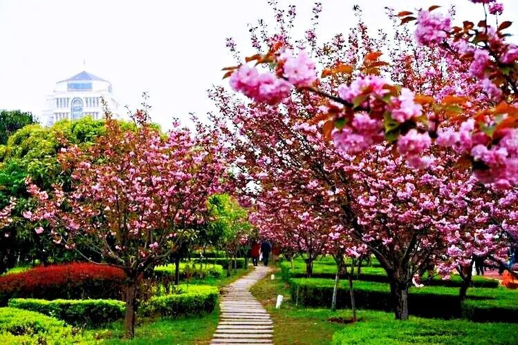 阳春三月,绿柳笼烟,正是关山樱盛开的季节。公园里、道路两旁,到处都是关山樱的风姿。远远望去,花团锦簇,红艳如火,异常美丽。