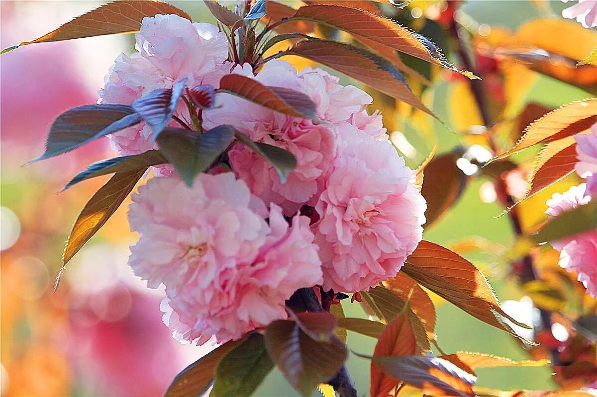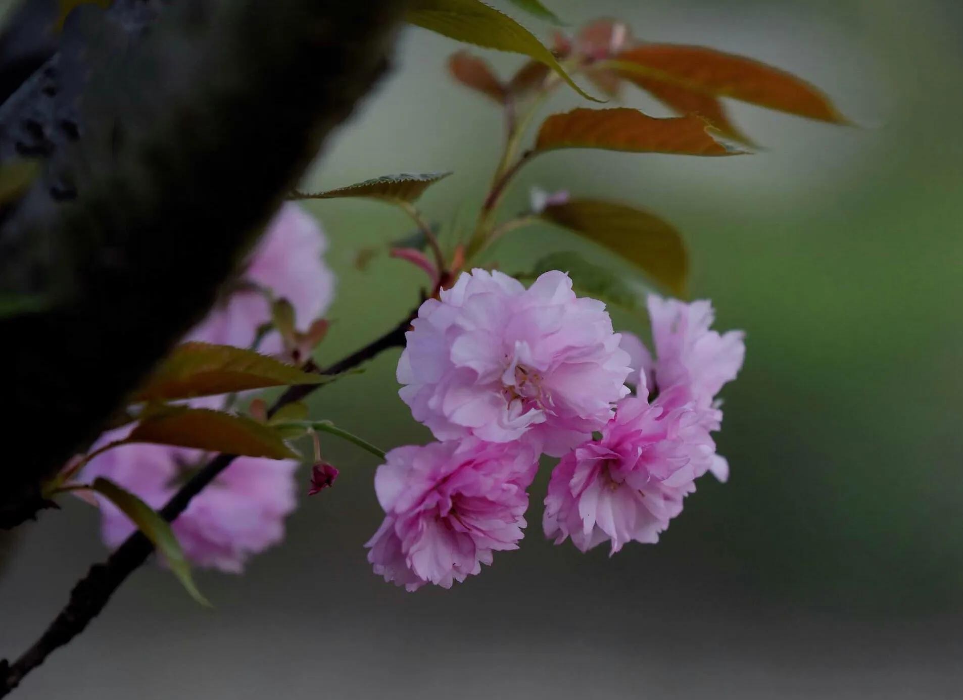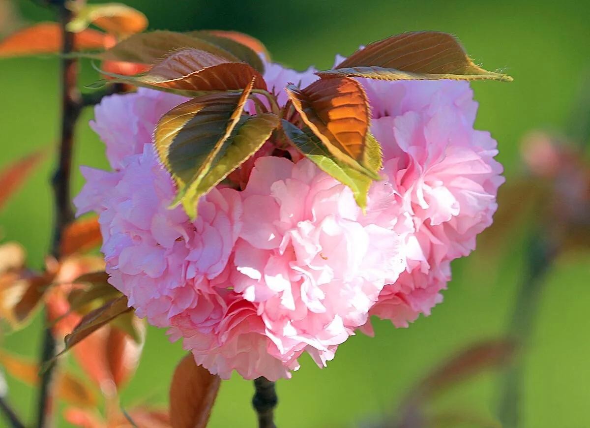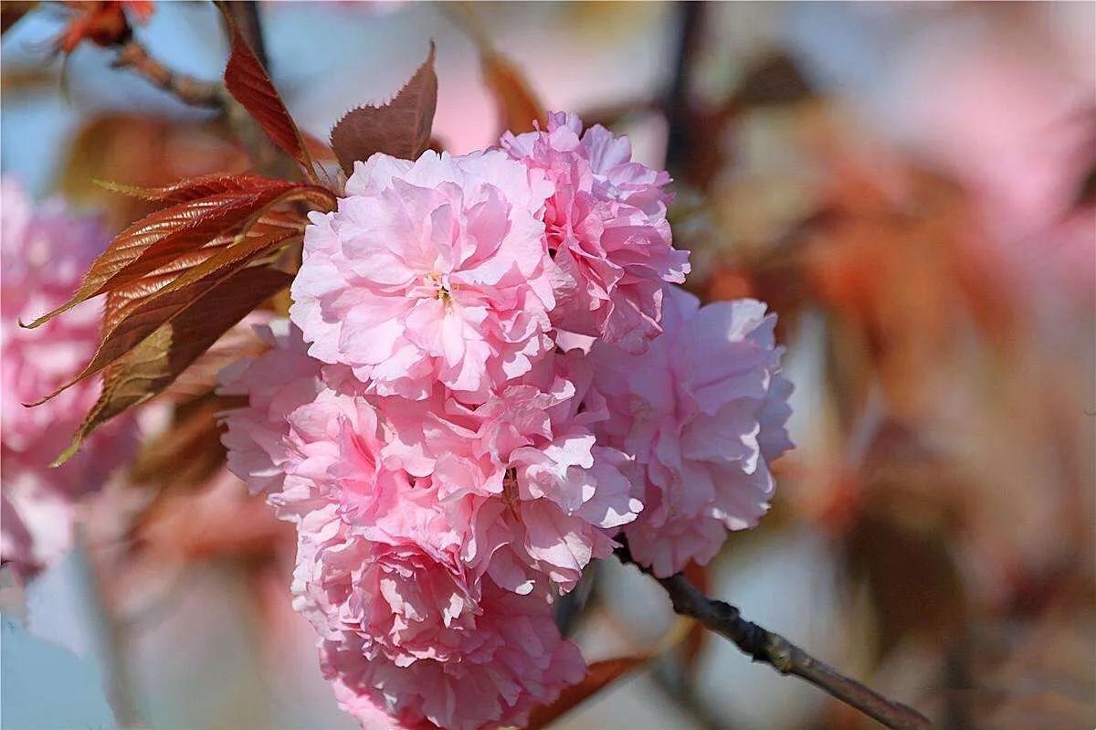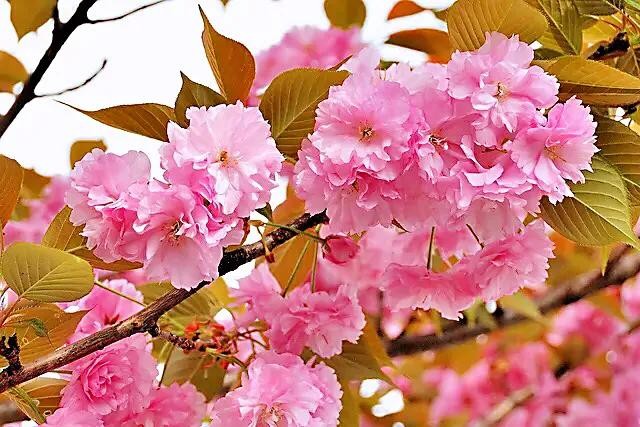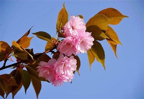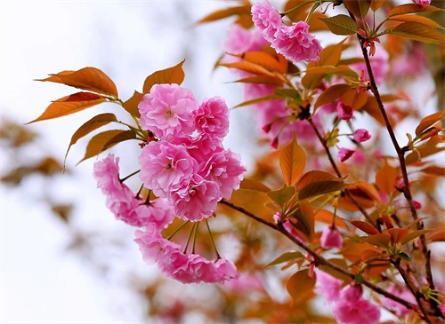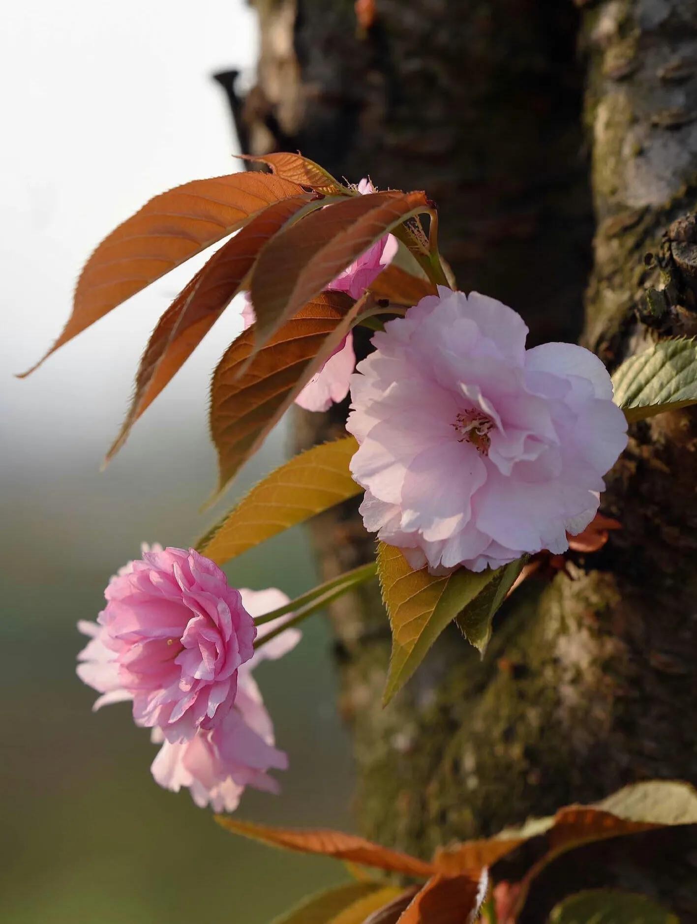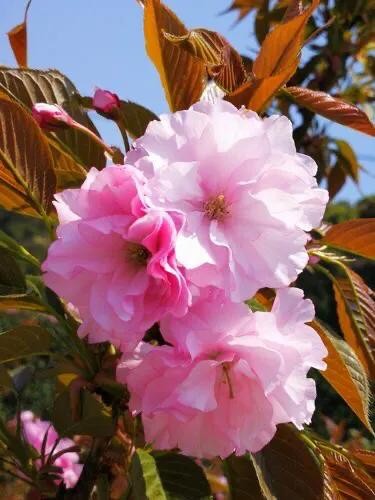 关山樱 分枝较多,小枝向上弯曲;嫩叶颜色为茶褐色,春季叶片紫褐色,秋季橙黄色,十分美丽。