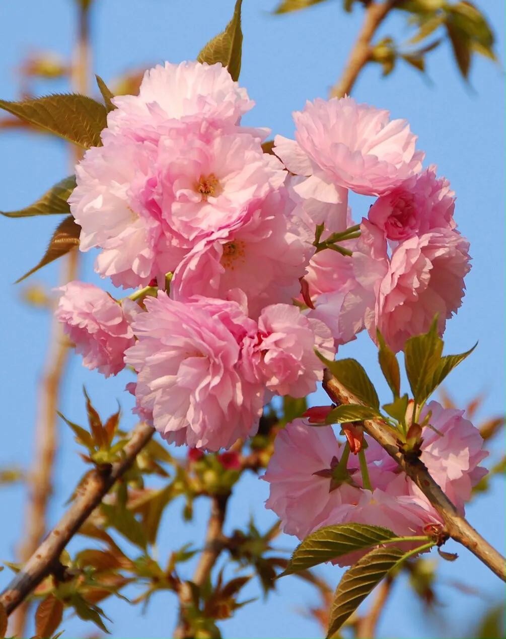 关山樱 花期3月底至4月,花叶同开。花粉红至浓红。花茎6厘米左右,花瓣约30枚,2枚雌蕊叶化,不结实,花梗粗且长。