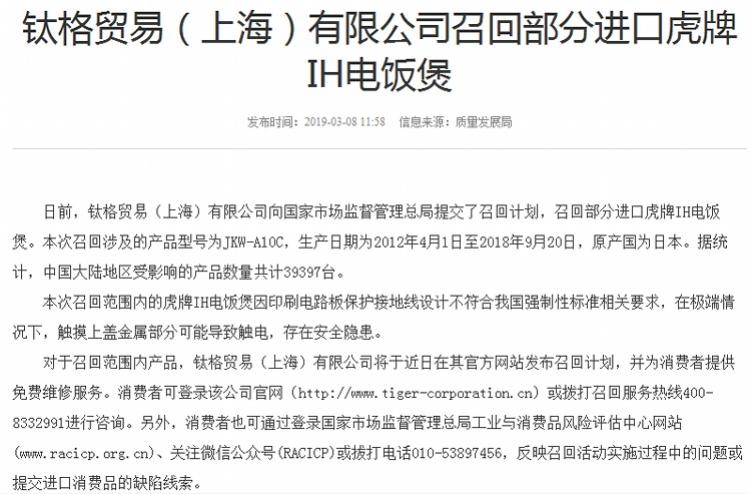 3月11日,南都记者从国家市场监督管理总局官网获悉,日前,钛格贸易(上海)有限公司向国家市场监督管理总局提交了召回计划,召回部分进口虎牌IH电饭煲。本次召回涉及的产品型号为JKW-A10C,生产日期为2012年4月1日至2018年9月20日,原产国为日本。据统计,中国大陆地区受影响的产品数量共计39397台。