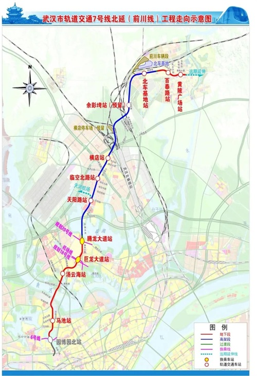 武汉轨道交通7号线北延线是武汉市第四期建设规划的重要线路,由7号线一期园博园北站至黄陂前川,全长36公里,设站11座(含预留站1座),其中高架站5座,地下站6座,途经东西湖区、黄陂区。起点预留向东延伸条件,天阳路站预留天河机场枢纽方向接轨条件。
