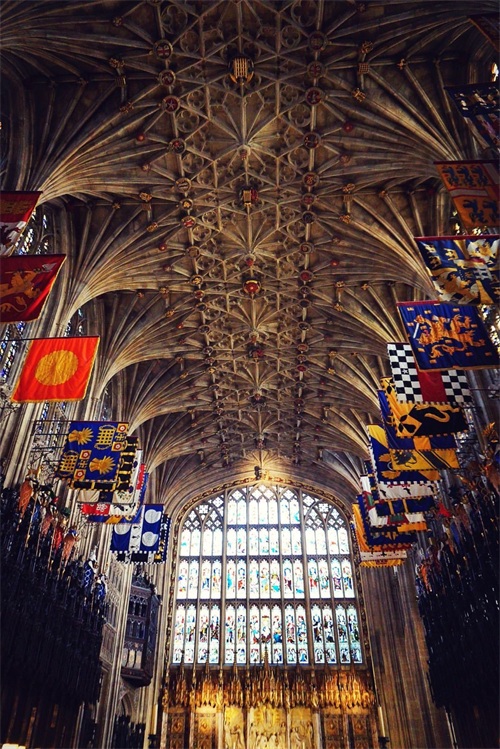 温莎城堡内富丽堂皇,旗子上显示的是英国各贵族的家徽。
