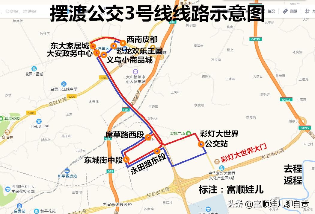 大山铺:内江方向车辆亦可在银昆高速(G85)大山铺出口下高速,下高速后左转经燊海井路1公里后左转上东环路,直行约3.5公里至东环路立交掉头再前行450米右转进入彩灯大世界停车场;初一至初六期间亦可下高速后直行前往大山铺西南皮革城或东大家居城停车场,停车后换乘免费摆渡公交3号线前往彩灯大世界。