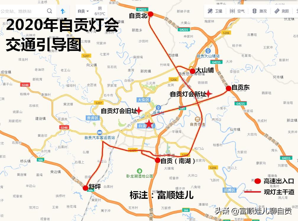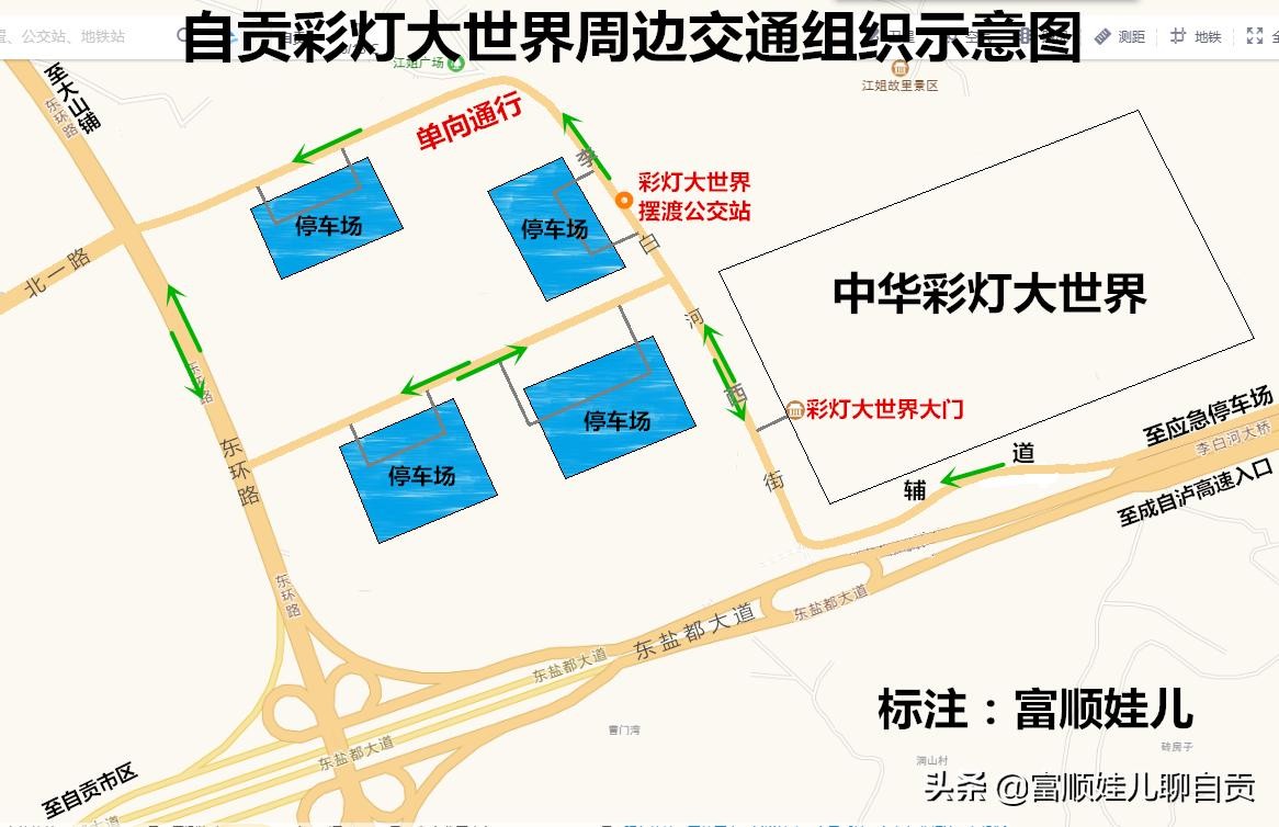观灯路径:外地游客前往自贡观灯主要有自驾和乘坐大巴两种方式,其中自驾游客可根据来向从自贡市区的以下5个高速出入口下高速。