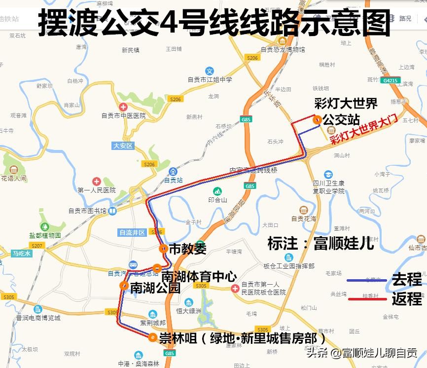 5号线:应急停车场—彩灯大世界(初一至初六开行),以新建自贡东高速出口至彩灯大世界的辅道为5号线往返线路,只设起点站、终点站,中途不设站。