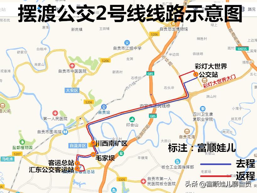 2号线:汇东公交客运站—彩灯大世界(灯会开幕至闭幕全程开行)。去程站点为:汇东公交客运站—客运总站—毛家坝—川西南矿区—彩灯大世界,只上不下;返程站点为:彩灯大世界—川西南矿区—毛家坝—客运总站—汇东公交客运站,只下不上。