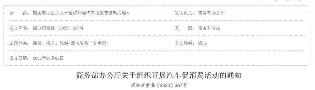 据中国消费者报,6 月 8 日,商务部办公厅印发《关于组织开展汽车促消费活动的通知》(以下简称《通知》),提出为进一步稳定和扩大汽车消费,开展 " 百城联动 " 汽车节和 " 千县万镇 " 新能源车消费季,活动时间为 2023 年 6 月至 12 月。具体来看,此次政策覆盖车型不仅包括新能源车,还包括传统燃油车型。