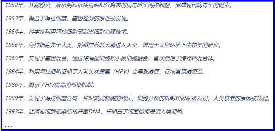 海拉细胞也曾被用于研究原子弹爆炸对人体的影响,化妆品的过敏检测等。治疗艾滋病的药物的研制,新冠疫苗的研制中也离不开海拉细胞的参与。