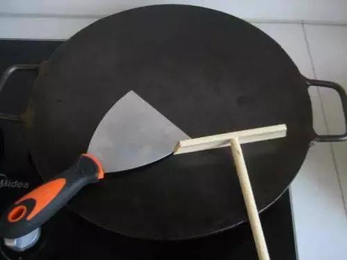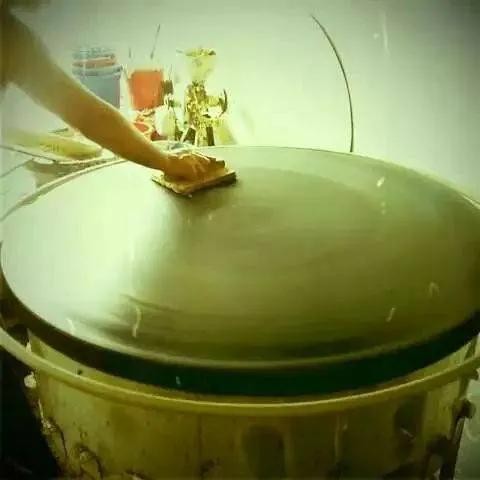 5、使糊糊均匀的摊在鏊子上,慢慢的用竹片的小耙子在上面转圈,使它定型,成熟。