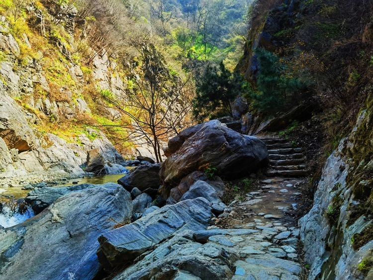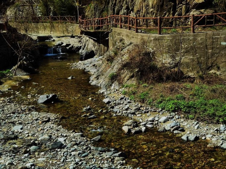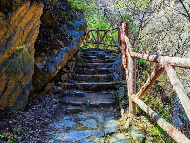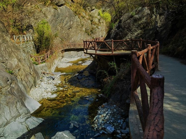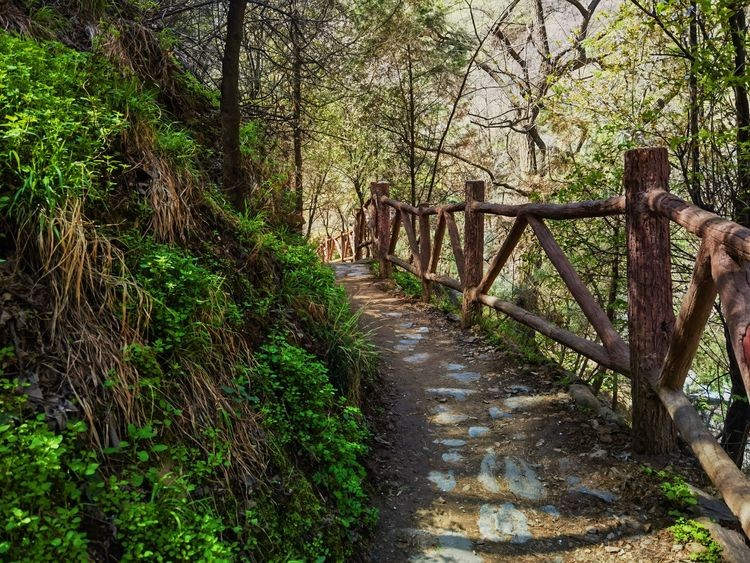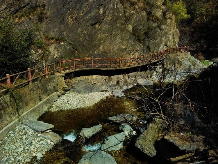 古栈道,古时,邑人为躲兵燹,凿崖成孔,叠石架木为道,避居深山,因而沿谷留下多处栈道。长约近千米,或凌于水,或倚于崖,险妙无比,承载着古今行人的足迹,给人以“天梯石栈相钩连”之感。